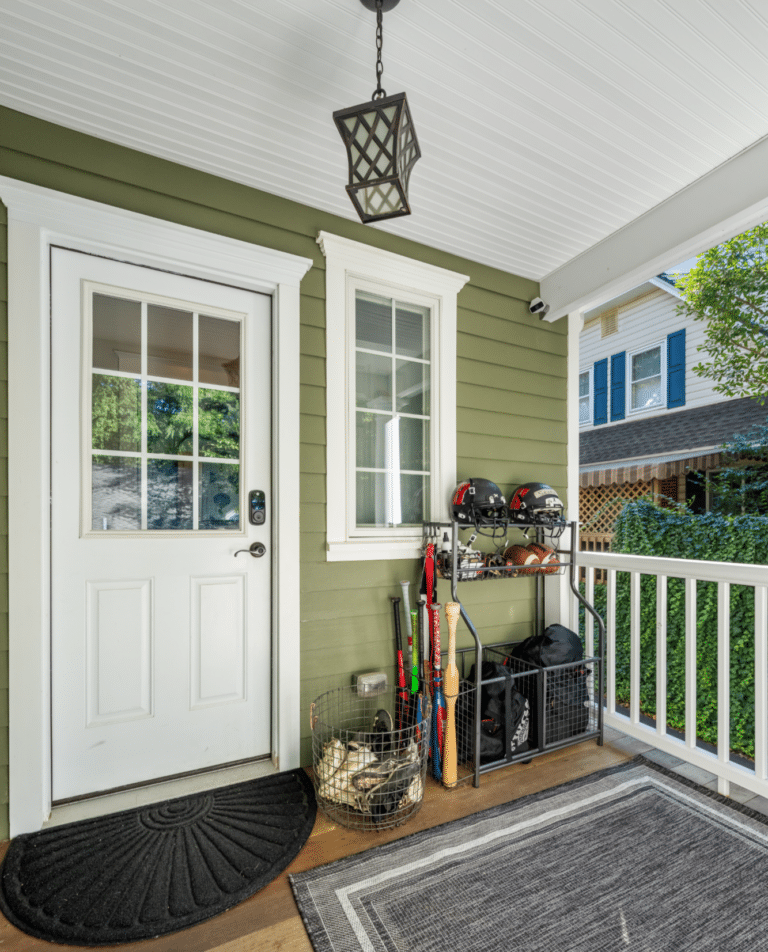 We are on either a football or baseball field every day of the week. Football equipment not only takes up a ton of space, but it also smells terrible. We needed a practical solution that would reduce the “15-minutes-before-practice-meltdowns” when my boys can’t find their equipment. We have a covered back porch area off the driveway with a doorway leading into the mudroom. This felt like wasted space; I mean a rocking chair would be nice, but who has time to sit and relax these days?! (spoiler alert: not me). Considering this space is both covered and outdoors, it was the perfect spot to store and air out their gear. I found a metal sports rack online to store equipment and ordered a wire basket for cleats. I organized their equipment seasonally; the off-season gear is stored in the garage, while the current sports equipment is accessible for daily practices.