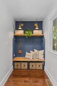 The Snyder Group, and Jill Bonawitz from Meant to Bee Home, we decided to open the wall all the way up to the ceiling. This would make the space feel bigger and ultimately more functional. My goal was for each child to have a hook, a basket up top for seasonal items like hats/gloves, and a basket under the bench for shoes. I liked the idea of board and batten to create designated spaces without needing lockers. Spencer recommended a wood bench to match some other furniture pieces we have throughout the house. Since this space is next to our powder room, Jill advised me to have it painted a deep navy blue to pull from the wallpaper that we just hung.