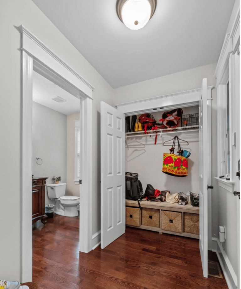 We moved into our new home at the end of last school year. I realized pretty quickly that our coat closet by the back door wasn’t going to cut it. The layout didn’t function for a family with young children: heavy doors that would often stick when trying to open, a single bar with hangers for coats, no hooks to hang bags, and our old bench squeezed in so tightly that the baskets for shoes wouldn’t pull all the way out. None of this made it easy for our boys to put their items away and created a literal “drop zone.” I began researching better solutions and came across ideas for creating a mudroom out of a closet. The first option I considered was removing the closet doors and leaving the trim, however, this wouldn’t fix the issues of baskets not pulling all the way out, and would make the upper shelf very difficult to access.