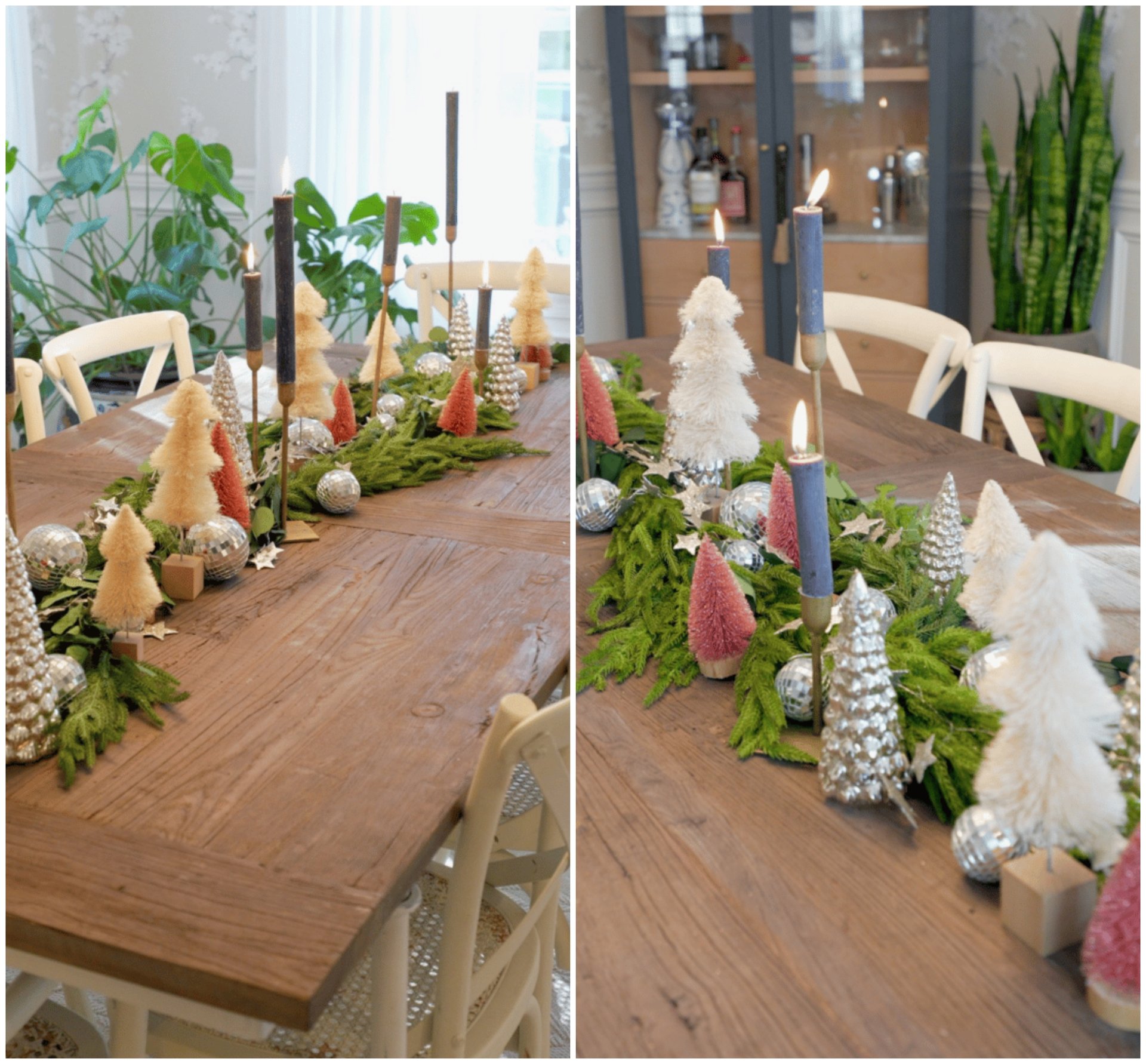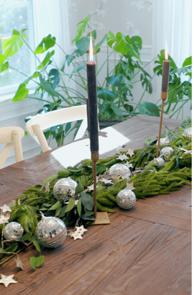I love holiday decor that can be used throughout the season in different ways. Disco balls are the showstopper of this non-traditional centerpiece. I love how they capture and reflect light to make the tablescape look magical at any time of the day. We layered them on top of green garland from Afloral mixed in some dried eucalyptus, and added a sparkly star garland. We also used mini bottle brush & mercury glass Christmas trees throughout. Finally, these gold tapers with black candles added the perfect amount of height and contrast. (Disco balls, garland, trees, candles and tapers can all be found at Meraki Market).