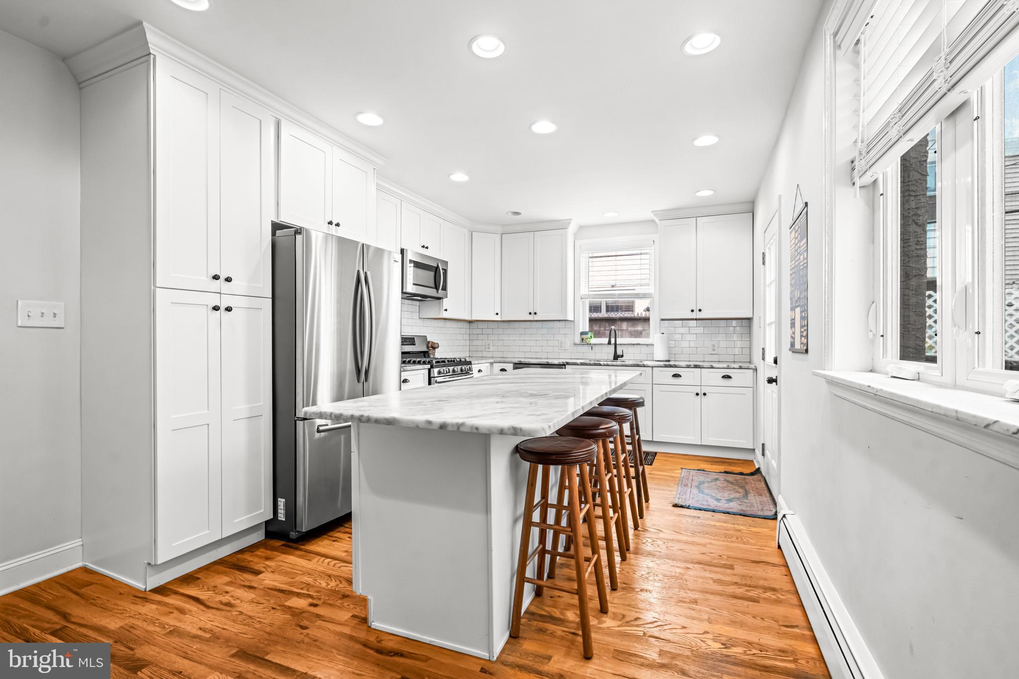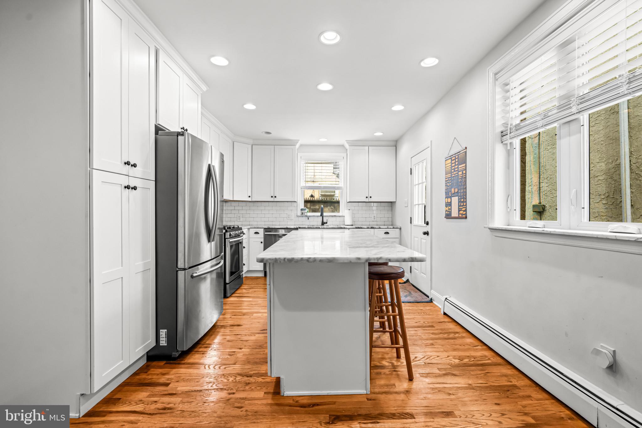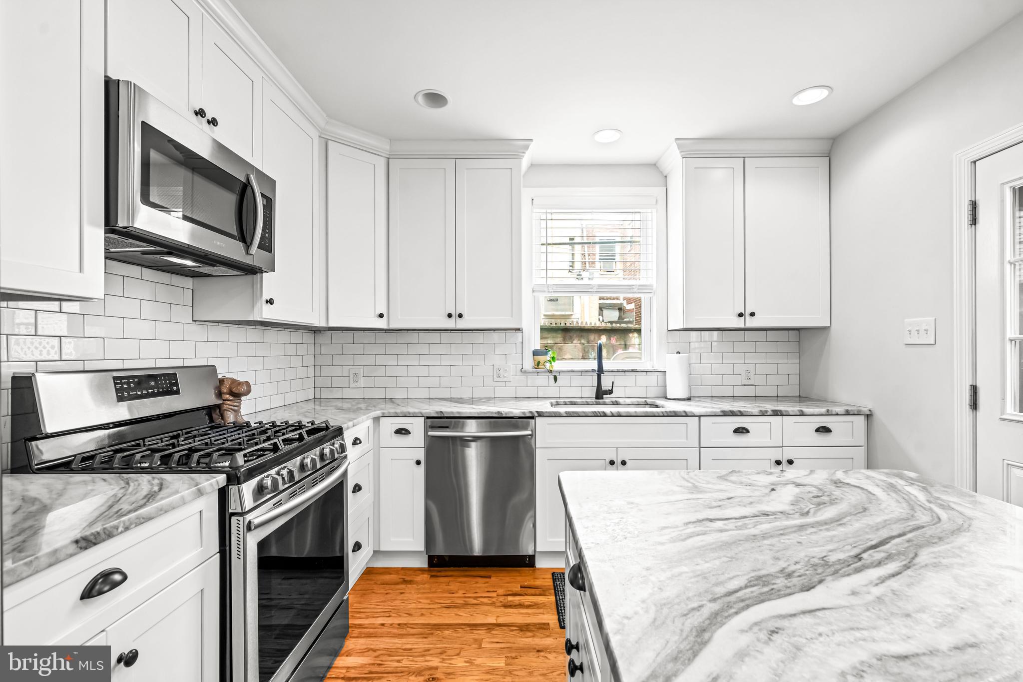 At the back of the home, the completely renovated kitchen is a true showstopper. It features white cabinetry, a classic subway tile backsplash, sleek stainless steel appliances, a large center island, and luxurious marble countertops that extend to a sunny windowsill. A rear door leads out to the fenced-in private yard, complete with a raised garden bed--perfect for relaxing, gardening, or entertaining guests outdoors.