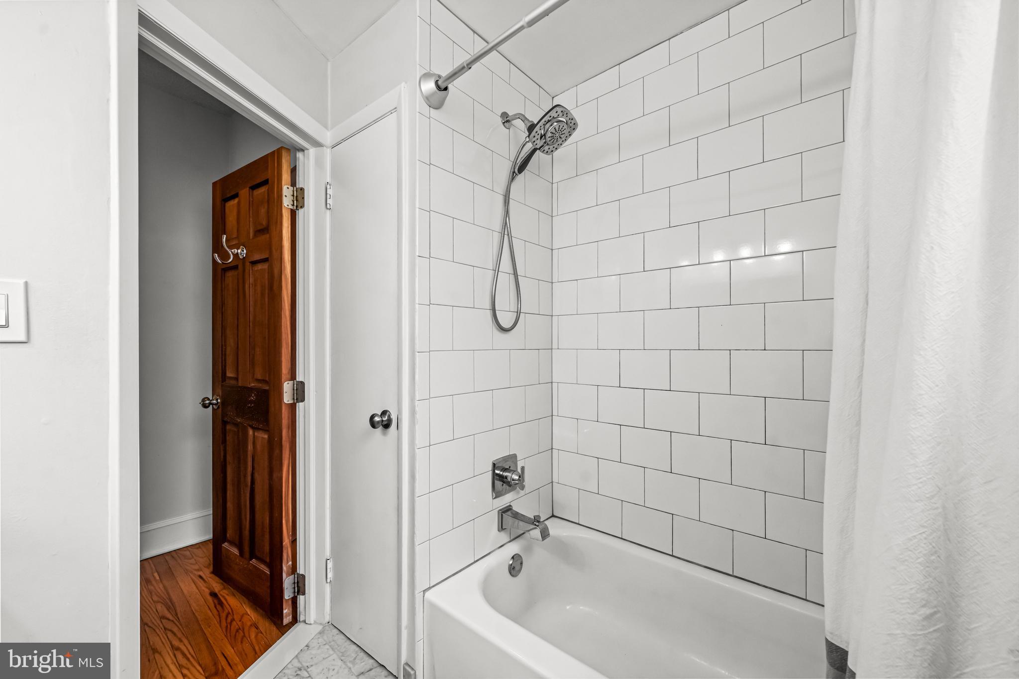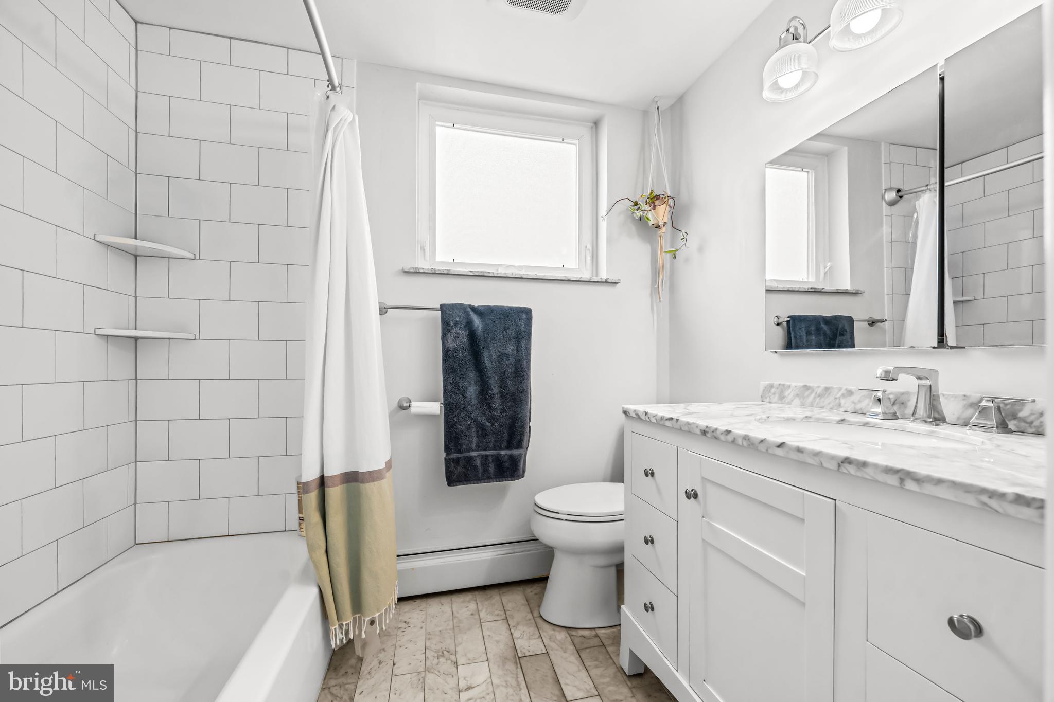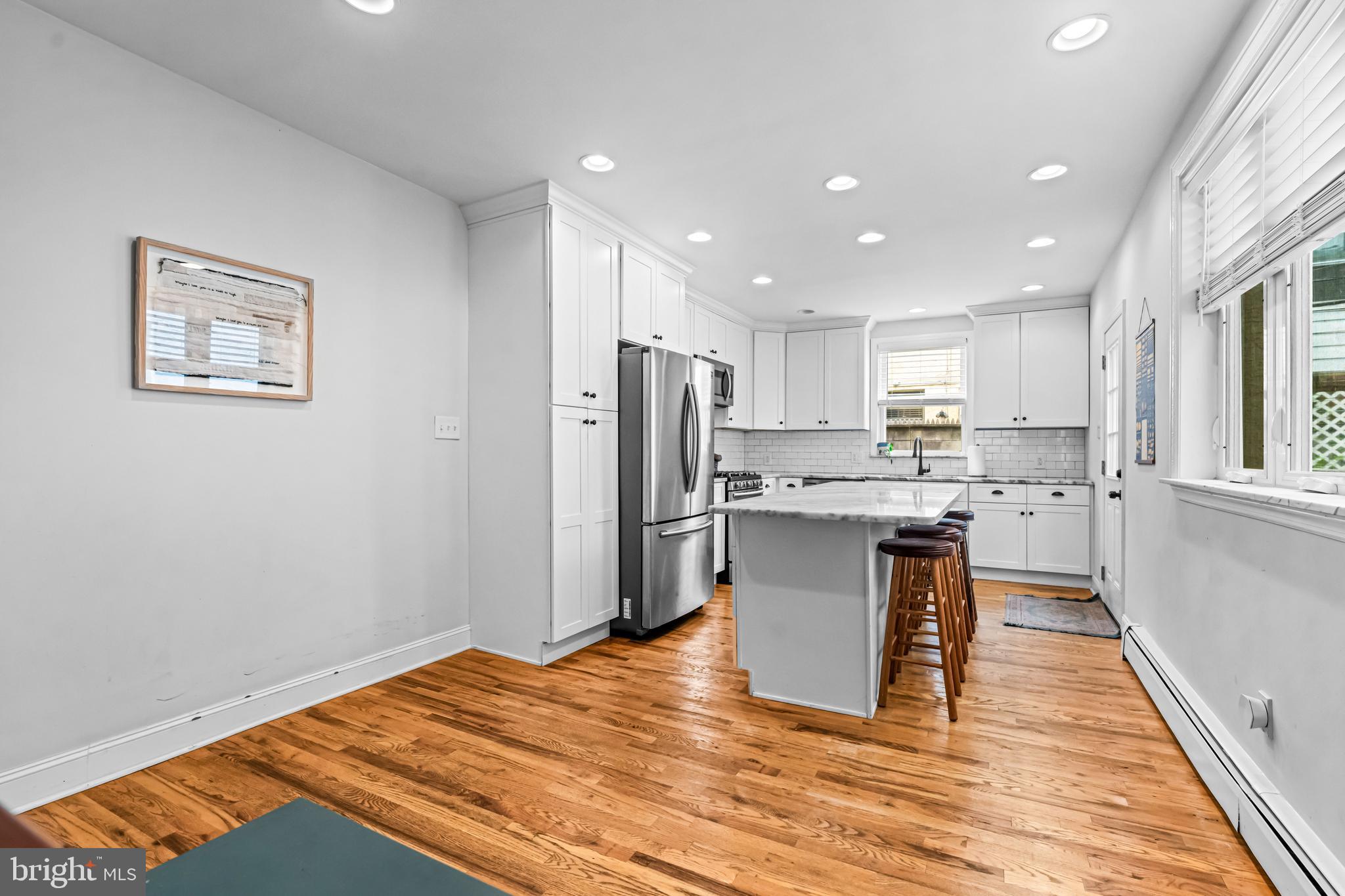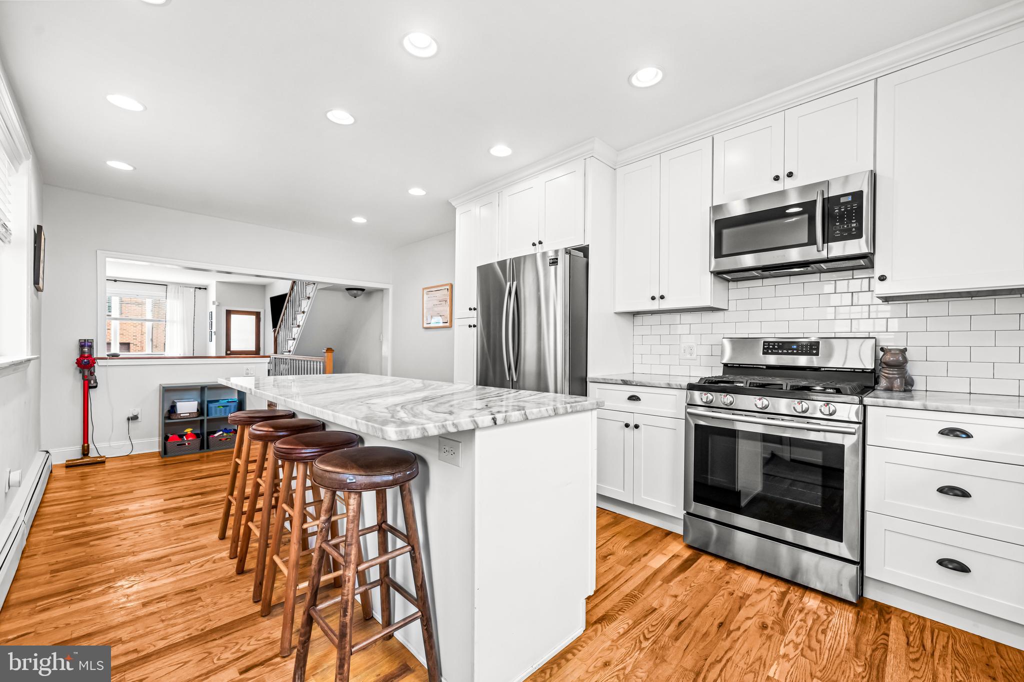 At the back of the home, the completely renovated kitchen is a true showstopper. It features white cabinetry, a classic subway tile backsplash, sleek stainless steel appliances, a large center island, and luxurious marble countertops that extend to a sunny windowsill. A rear door leads out to the fenced-in private yard, complete with a raised garden bed--perfect for relaxing, gardening, or entertaining guests outdoors.