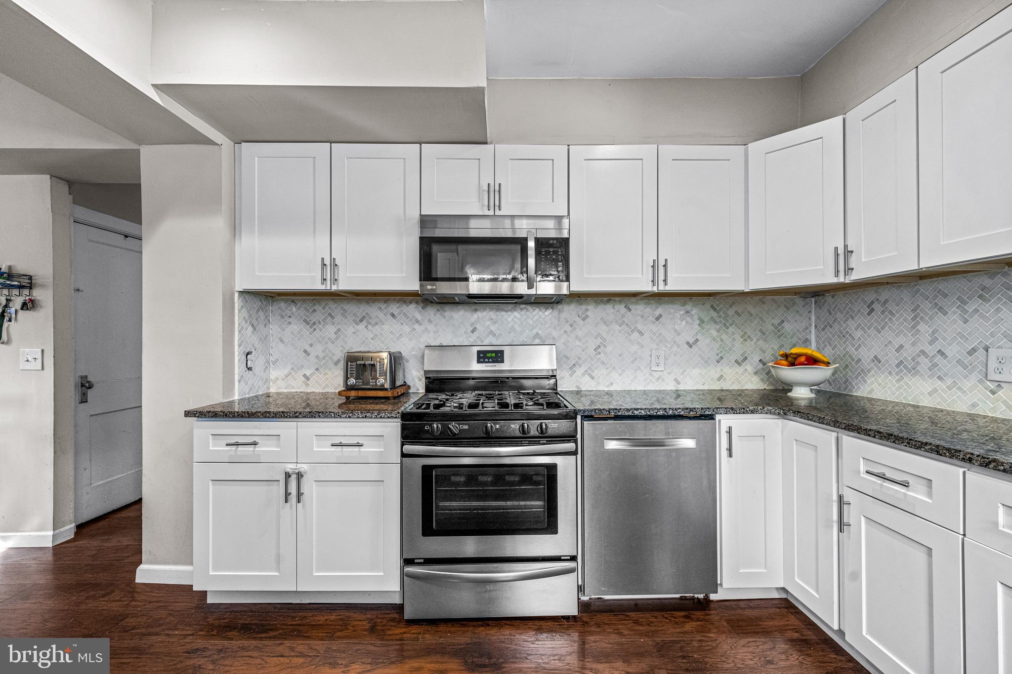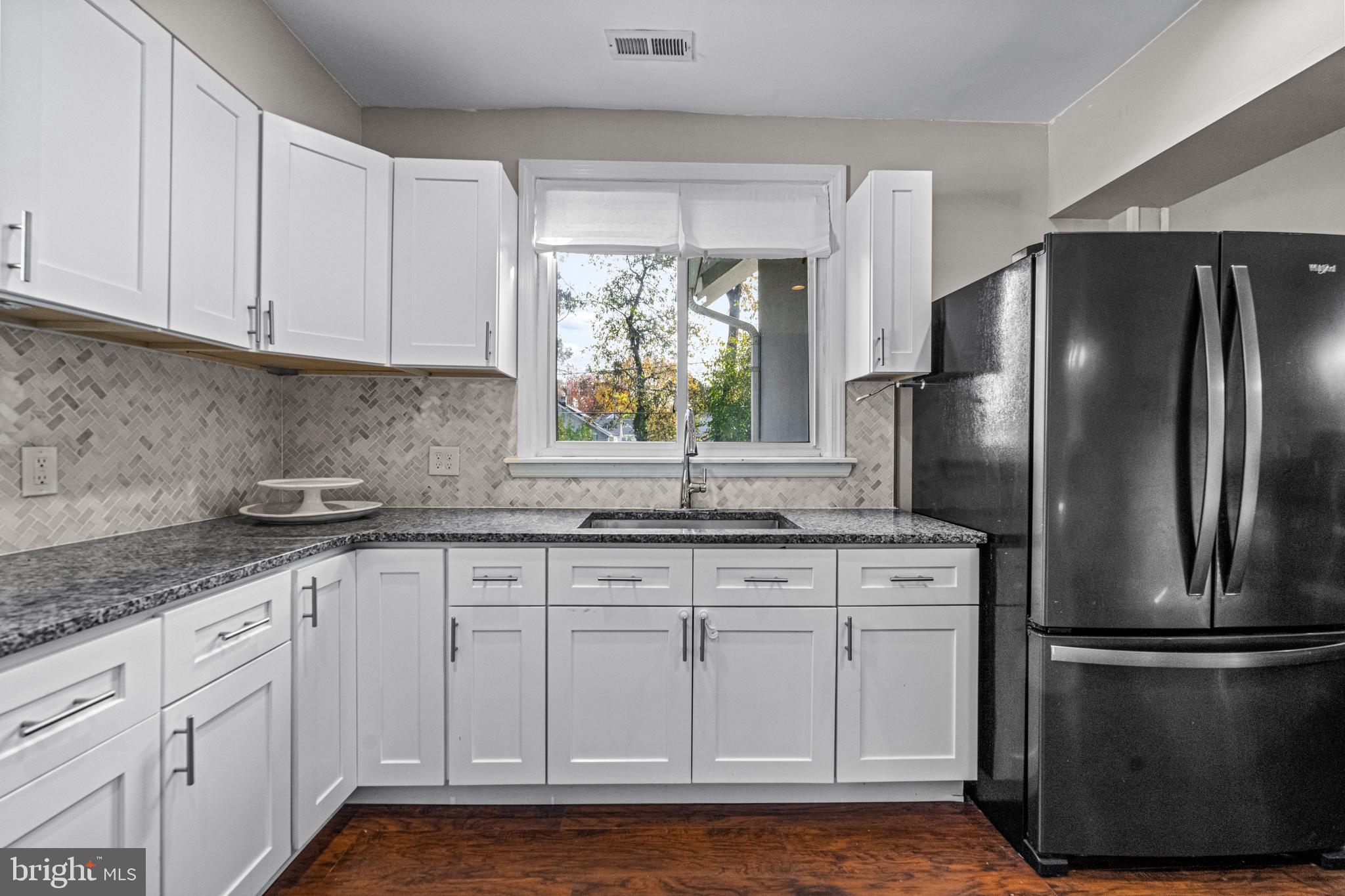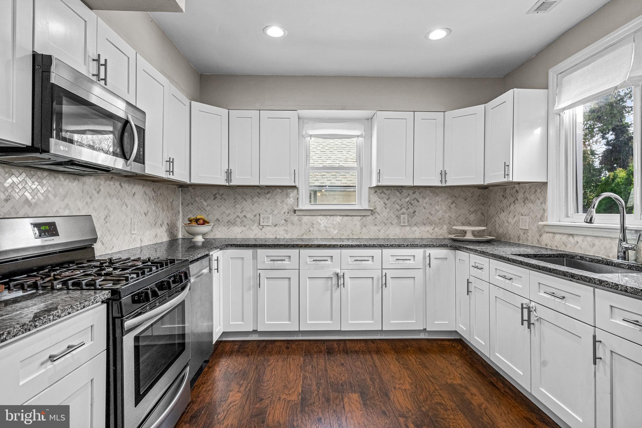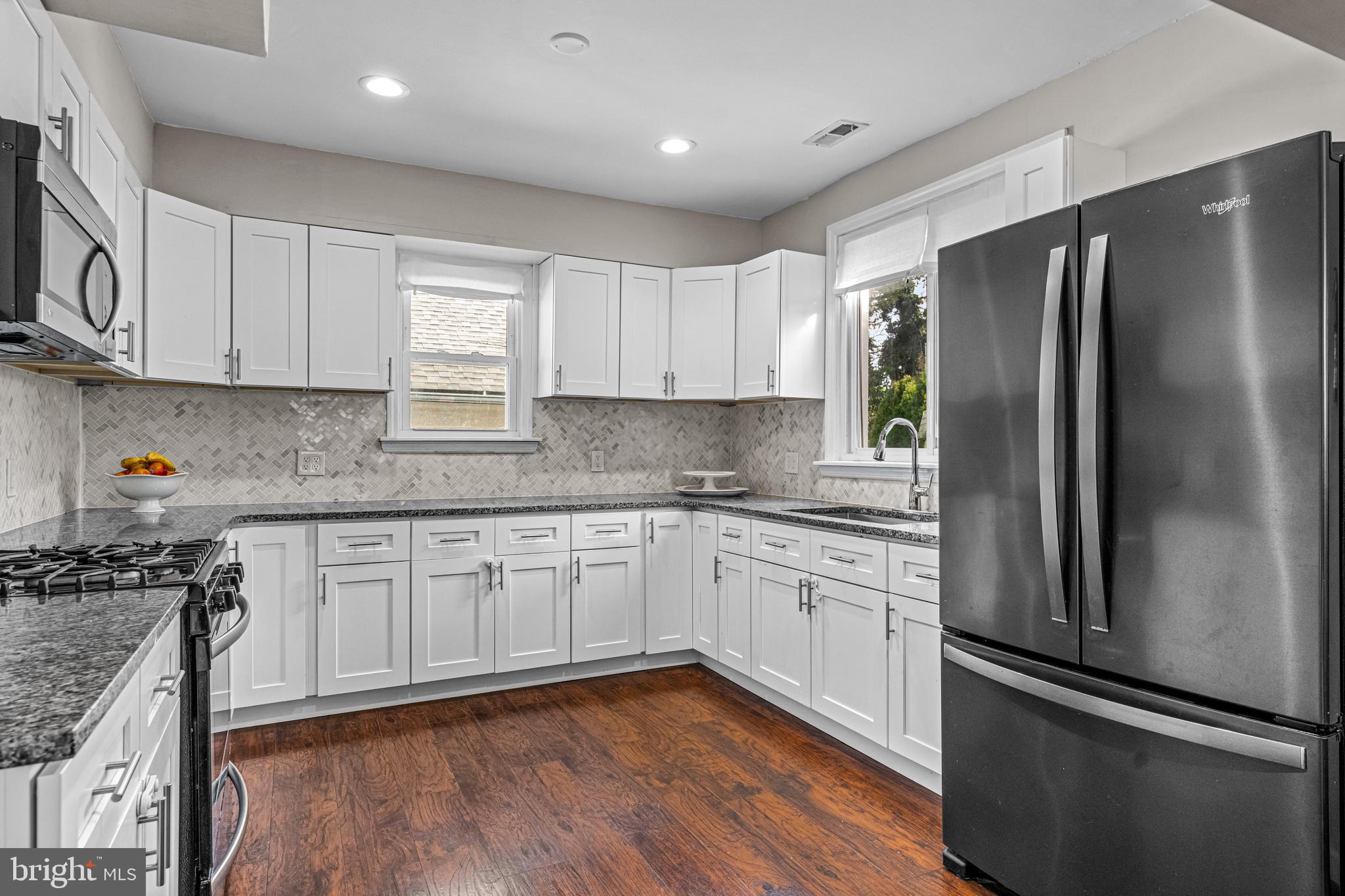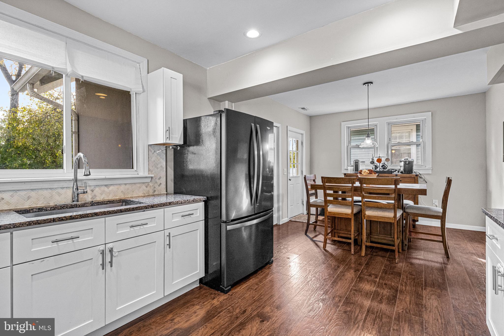 Step inside to the large living room with a brick fireplace, that is perfect for entertaining. The open layout seamlessly flows into the spacious dining room, providing space for hosting all your holiday gatherings. The updated eat-in kitchen features white cabinetry, granite countertops, and a beautiful herringbone patterned backsplash. The kitchen has ample storage with plenty of cabinet space and a pantry closet.