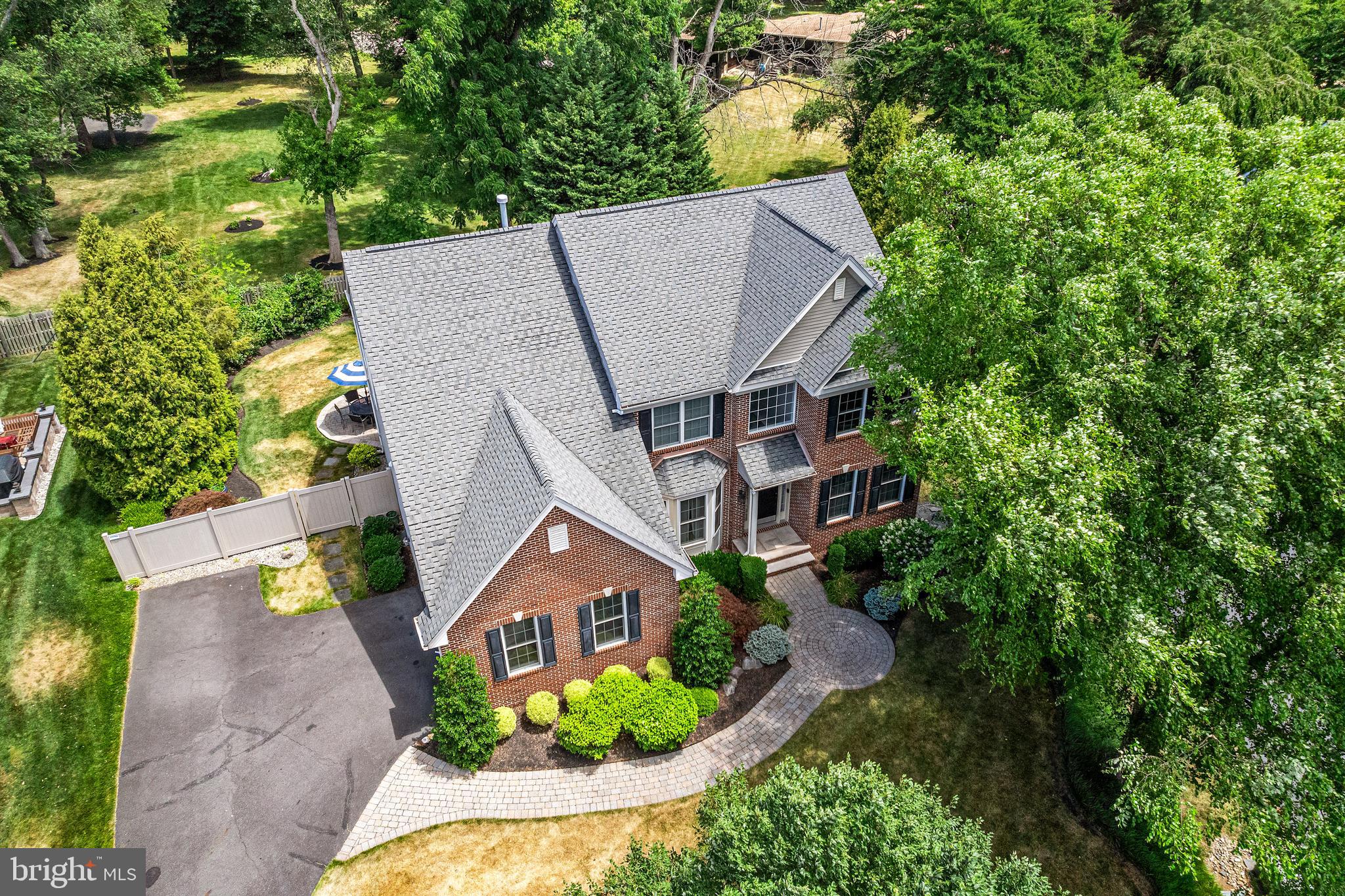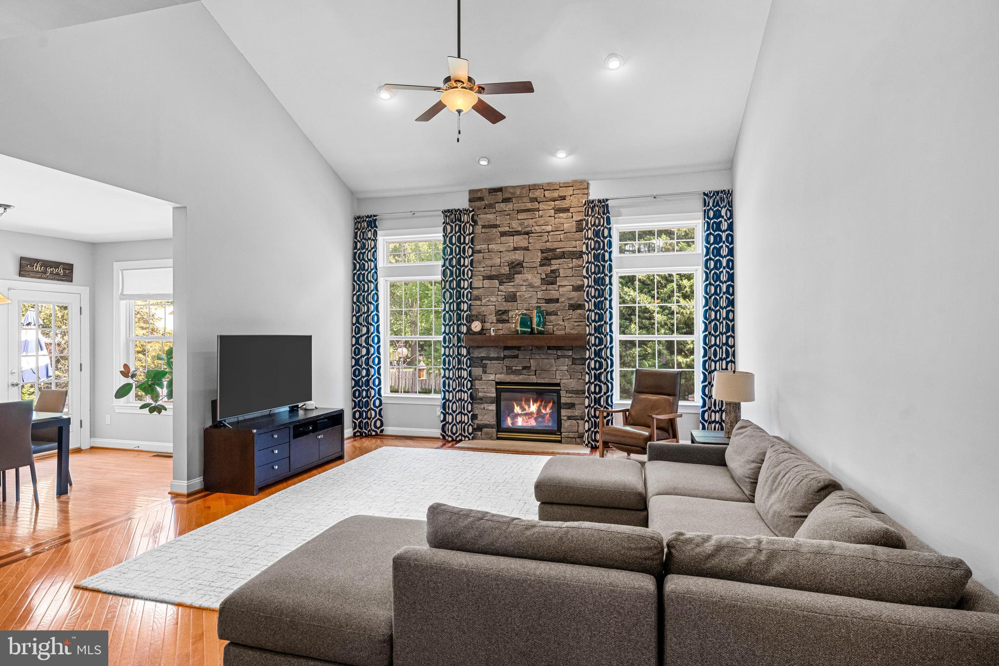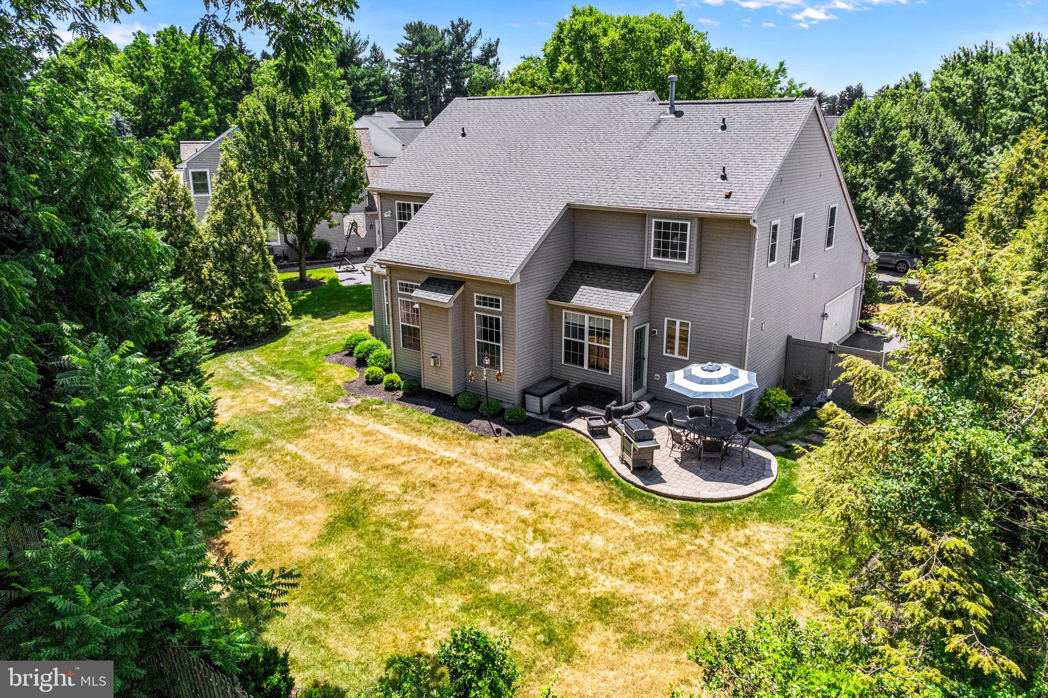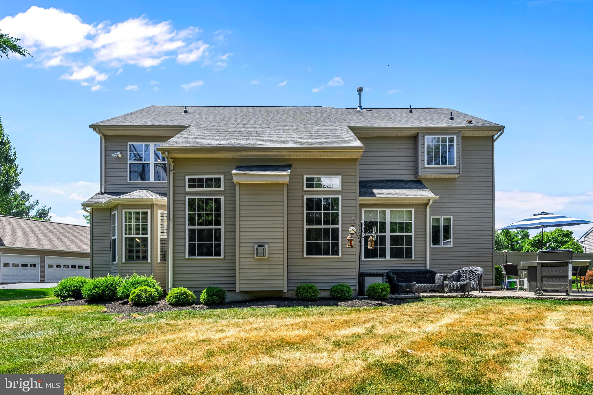 Professional landscaping and elegant pavers greet you as you approach this beautiful home. Step inside into a grand two-story foyer flanked by a formal dining room and living room on either side. Looking ahead the center hall leads to a stunning 2 story family room with an attention-grabbing custom stone fireplace and oversized windows. The family room connects seamlessly with the kitchen, featuring an extended dining area, a center island with additional seating, stainless appliances, dual ovens, and a large walk-in pantry. This space is perfect for entertaining. The main floor also features a full-size bedroom (which is currently used as a study), a full bathroom, a laundry room, 2 coat closets, and an oversized 2-car garage. Upstairs, the primary bedroom features 2 luxurious walk-in closets with all custom shelving, as well as a full bath with a large soaking tub, dual sinks, and shower stall. Three additional large bedrooms and a hall bathroom with dual sinks finish off the second floor. A paver patio and mature trees line the beautiful backyard. With no homes directly in front or behind, the yard has an exceptionally private feel. It's also one of the largest lots on this side of the community. Hardwood floors and numerous updates throughout, fresh neutral tones, updated fixtures, home automation features, recessed lighting, ceiling fans, wainscoting, upgraded moldings, and 2-zone HVAC are all featured in this magnificent home.