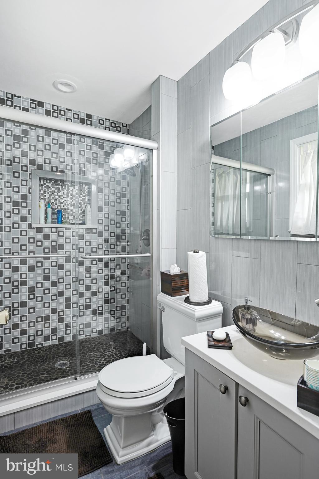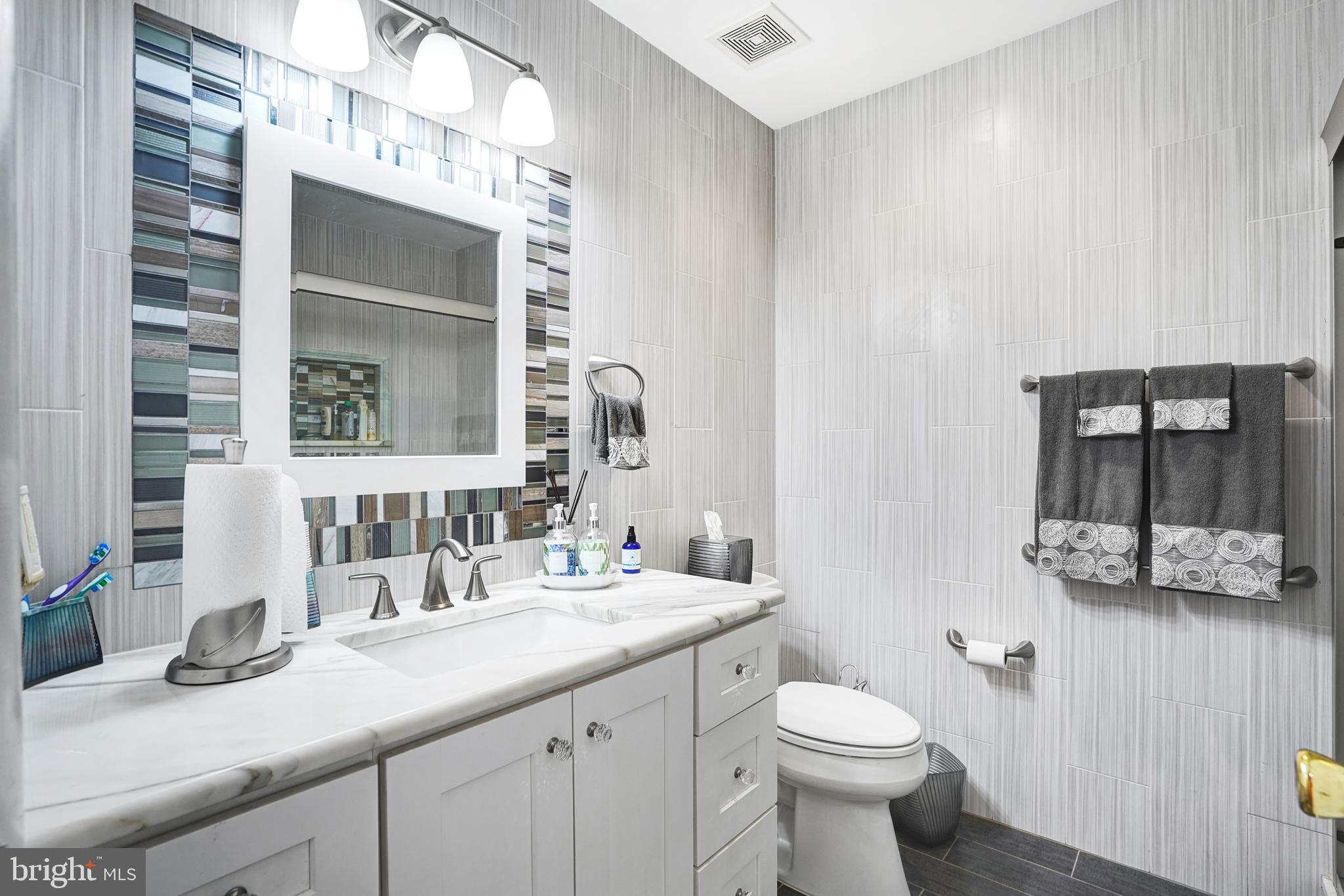 The primary suite offers a private bath, a walk-in closet, and an additional closet for extra storage. Two generously sized bedrooms share a full bathroom with elegant floor-to-ceiling tile finishes.