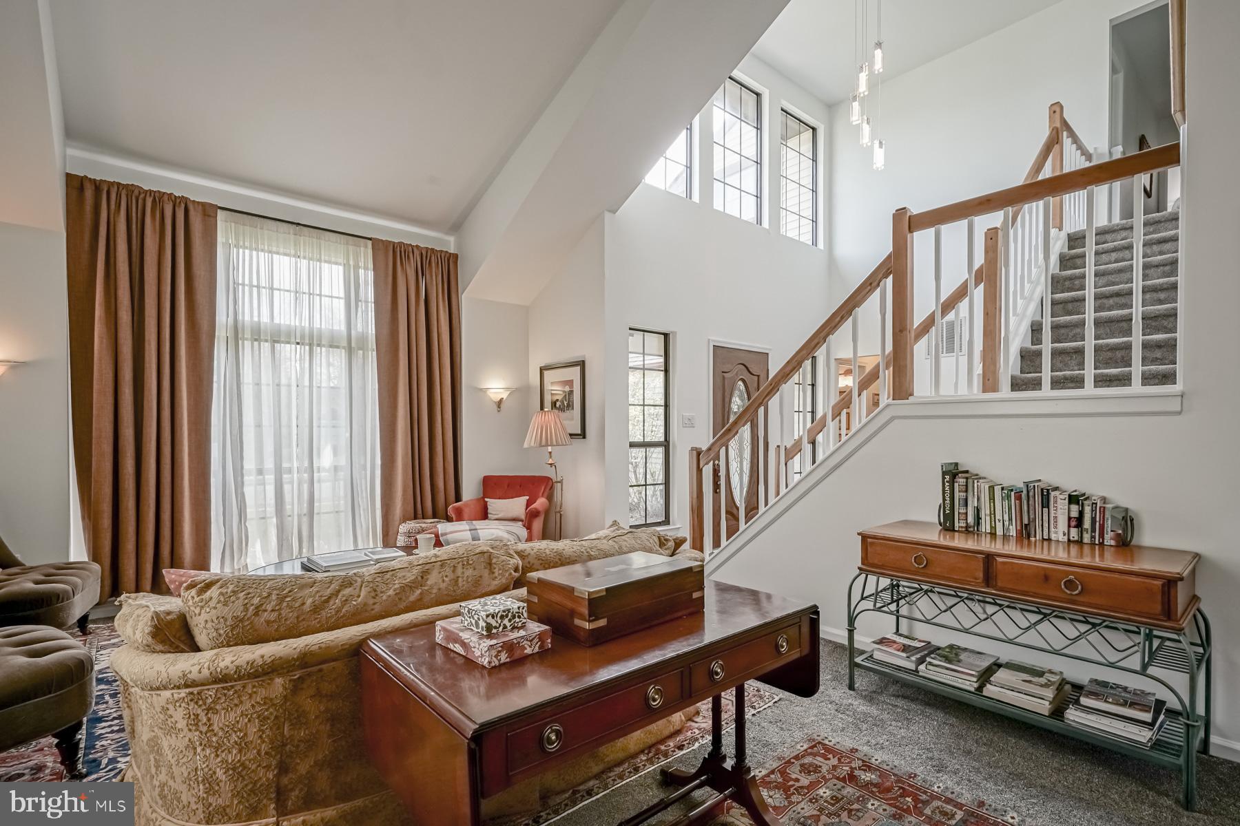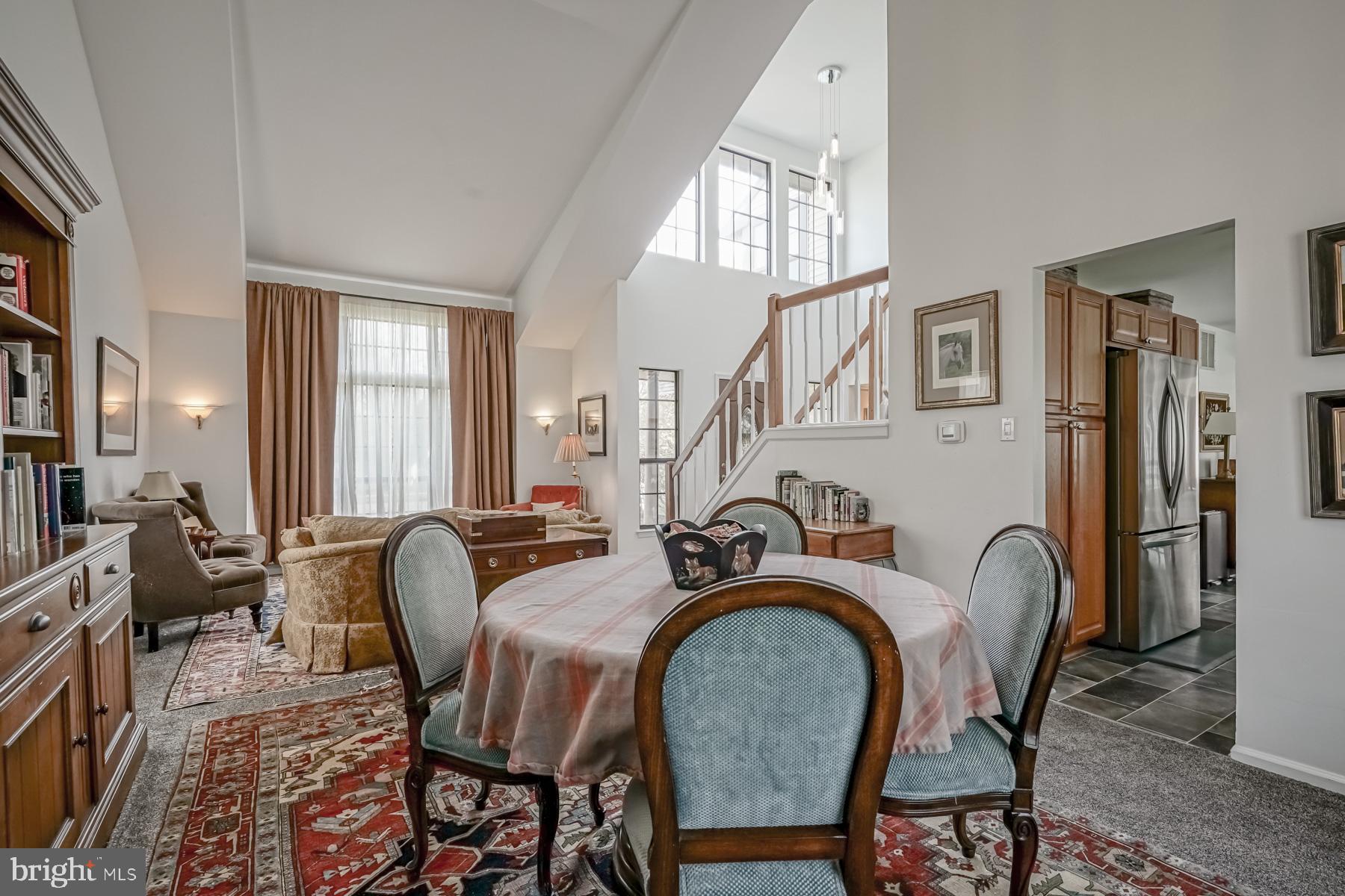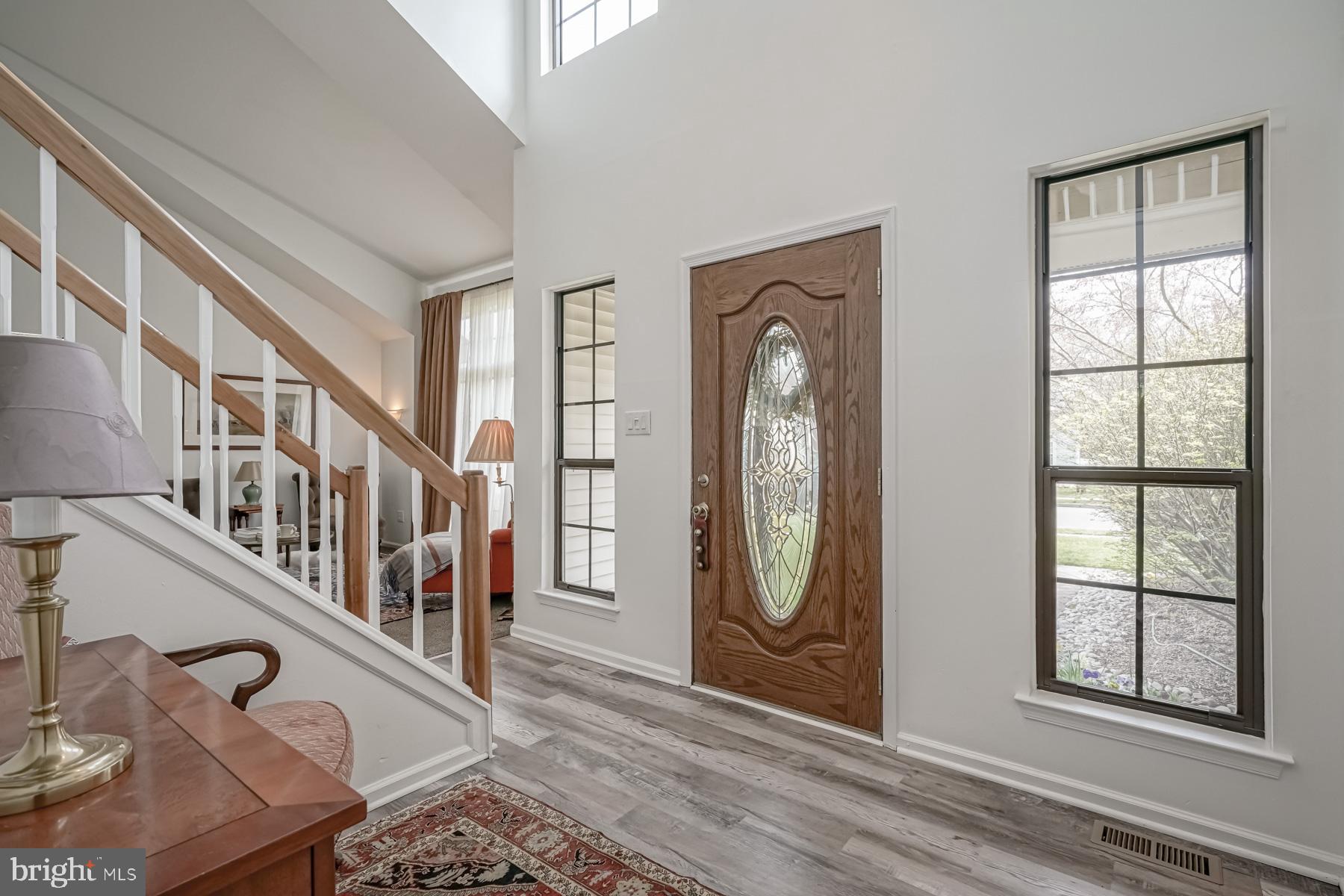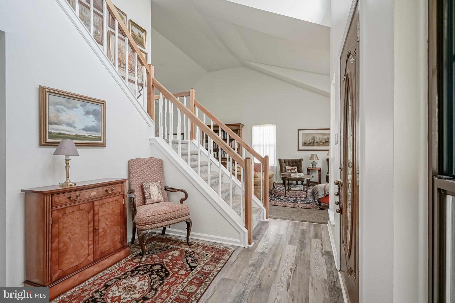 throughout will make you ready to want to move in and start enjoying it! The welcoming feel starts with the sundrenched, two-story foyer with newer flooring. Adjacent to the foyer are the living and dining rooms, complete with newer carpeting, large picture windows, and vaulted ceilings. These spaces are perfect for entertaining. The bright and airy feel continues into the large kitchen, featuring new appliances and countertop, an eat in area, breakfast bar, and oak cabinetry. The spacious family room is open to the kitchen for that open concept layout. You will be impressed with the refinished hardwood floors in this room, fireplace (presently sealed but can be converted), bump out area for a bar or built ins, and French doors leading to the backyard. The laundry room and updated powder room complete the main level of the home.