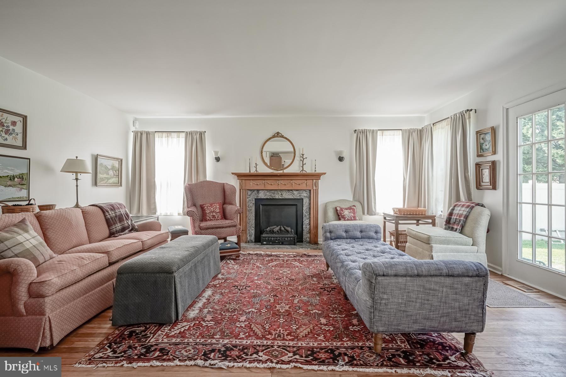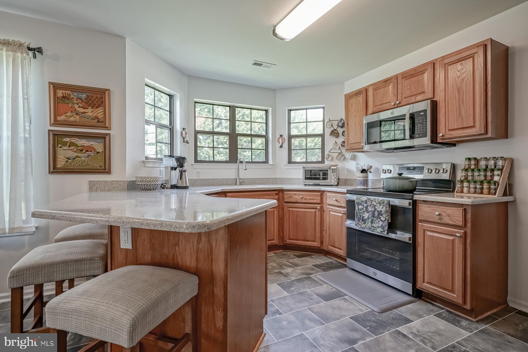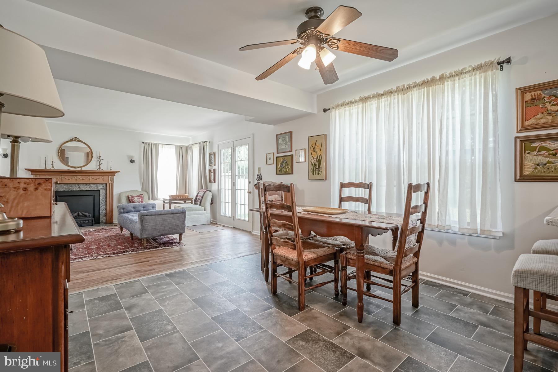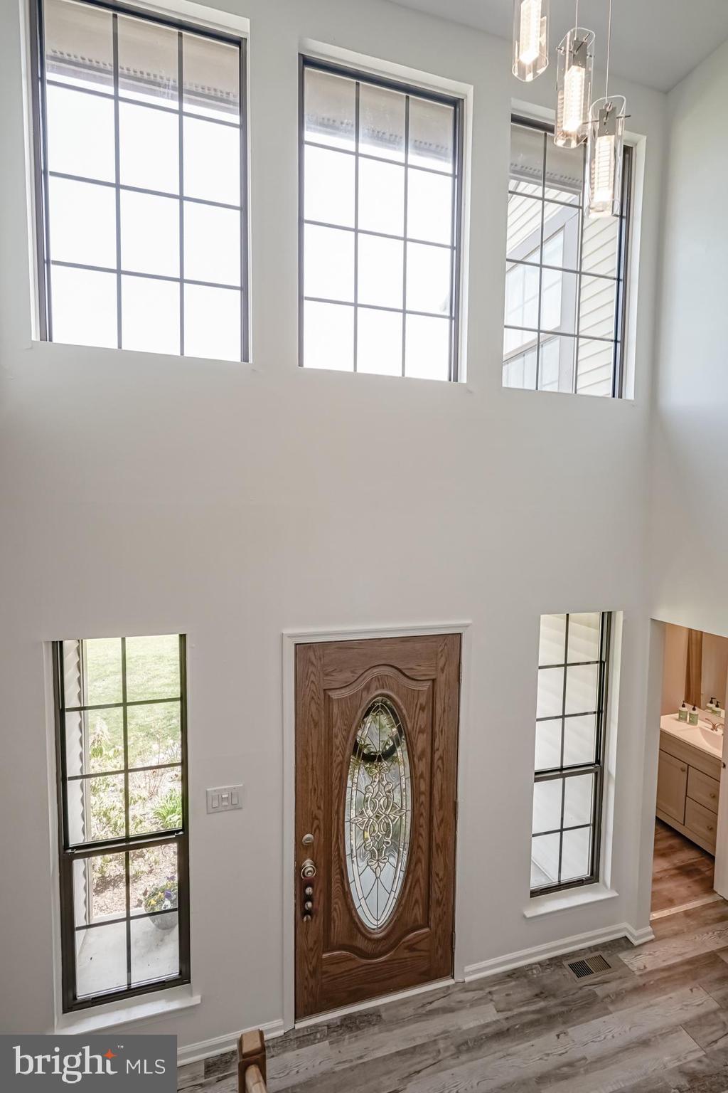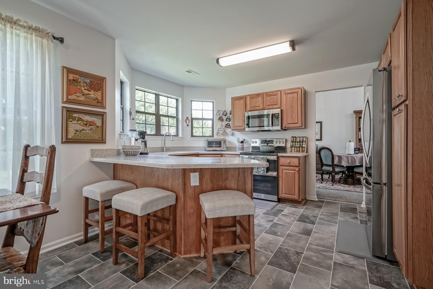 throughout will make you ready to want to move in and start enjoying it! The welcoming feel starts with the sundrenched, two-story foyer with newer flooring. Adjacent to the foyer are the living and dining rooms, complete with newer carpeting, large picture windows, and vaulted ceilings. These spaces are perfect for entertaining. The bright and airy feel continues into the large kitchen, featuring new appliances and countertop, an eat in area, breakfast bar, and oak cabinetry. The spacious family room is open to the kitchen for that open concept layout. You will be impressed with the refinished hardwood floors in this room, fireplace (presently sealed but can be converted), bump out area for a bar or built ins, and French doors leading to the backyard. The laundry room and updated powder room complete the main level of the home.