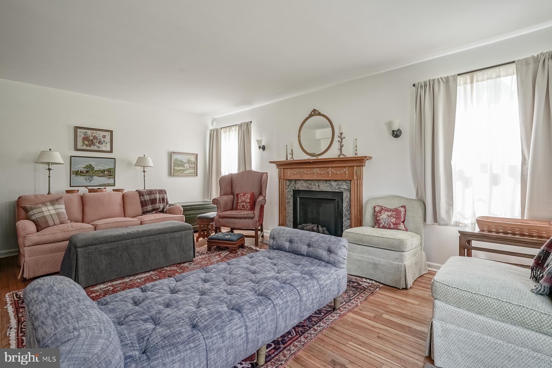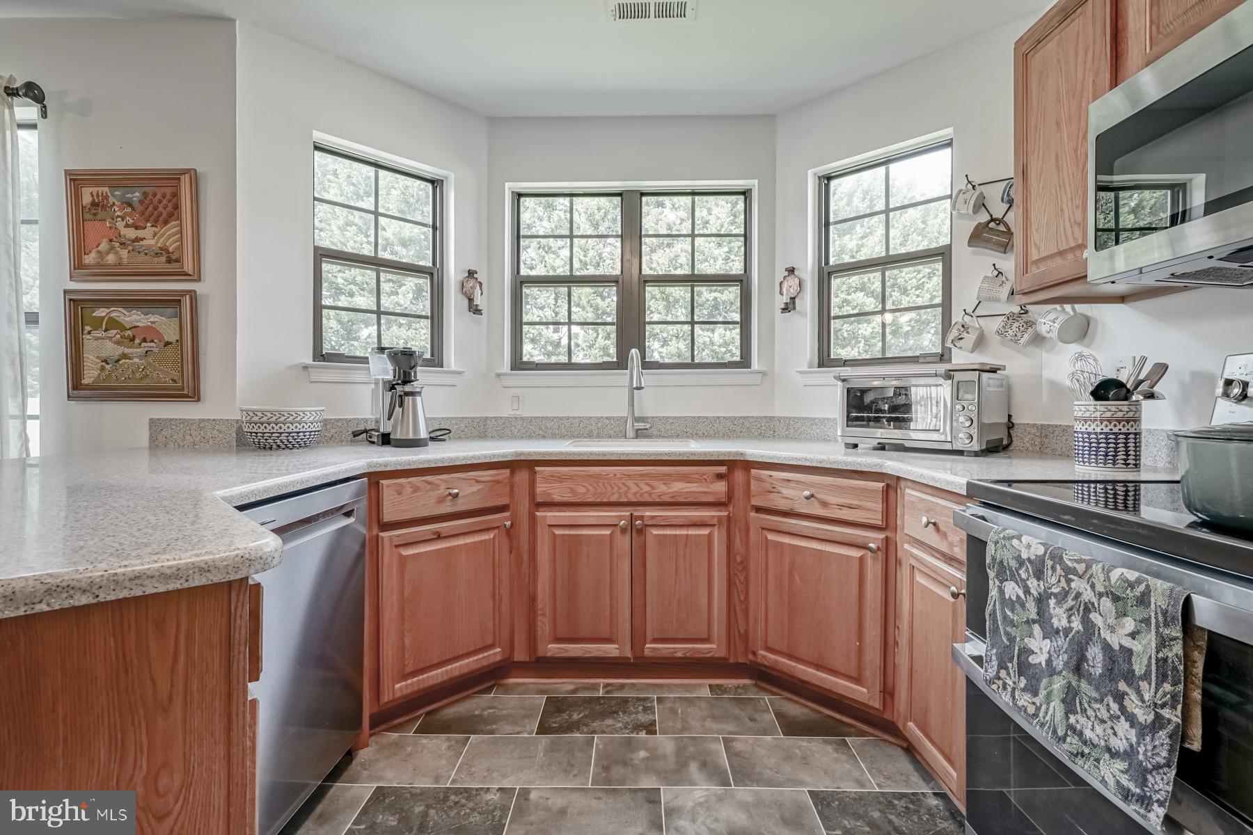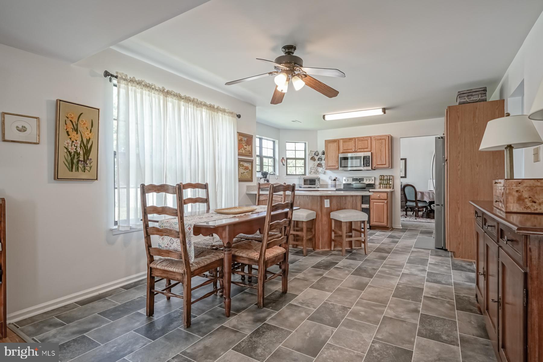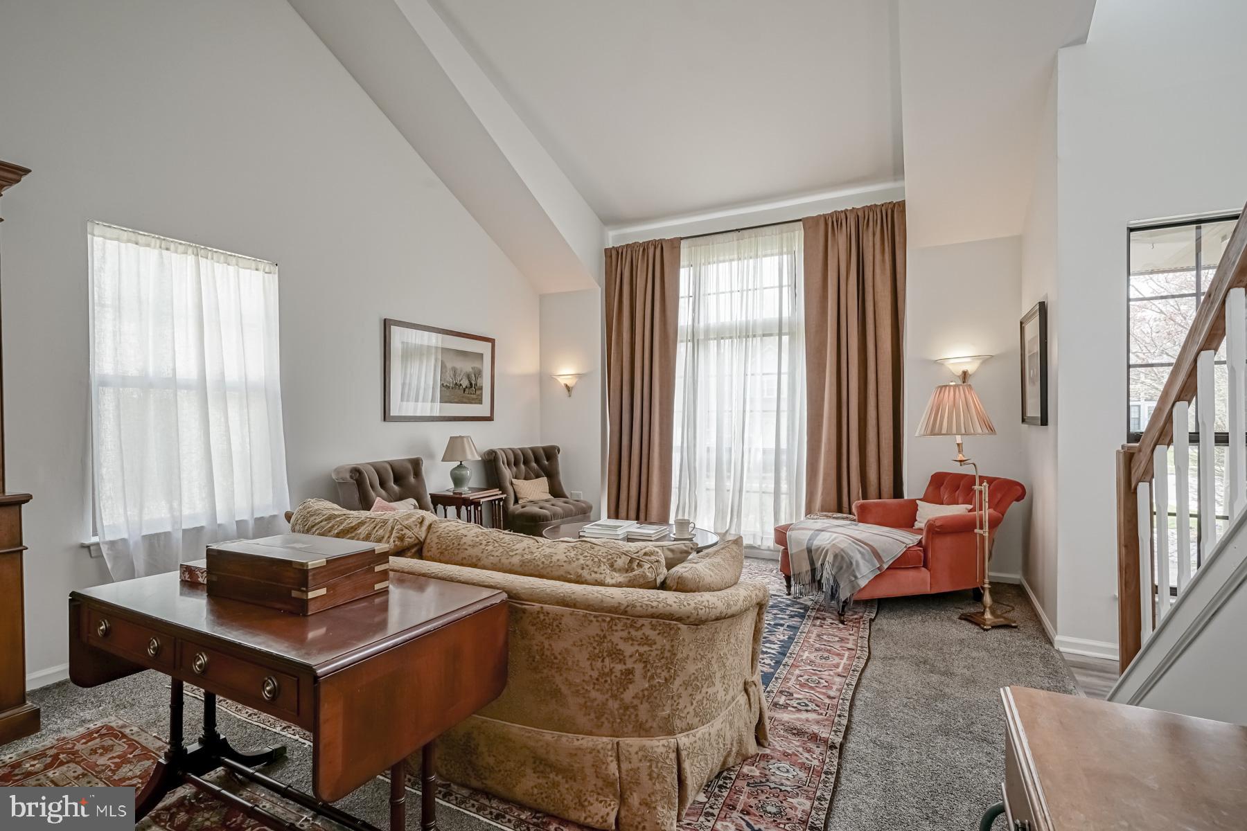 throughout will make you ready to want to move in and start enjoying it! The welcoming feel starts with the sundrenched, two-story foyer with newer flooring. Adjacent to the foyer are the living and dining rooms, complete with newer carpeting, large picture windows, and vaulted ceilings. These spaces are perfect for entertaining. The bright and airy feel continues into the large kitchen, featuring new appliances and countertop, an eat in area, breakfast bar, and oak cabinetry. The spacious family room is open to the kitchen for that open concept layout. You will be impressed with the refinished hardwood floors in this room, fireplace (presently sealed but can be converted), bump out area for a bar or built ins, and French doors leading to the backyard. The laundry room and updated powder room complete the main level of the home.