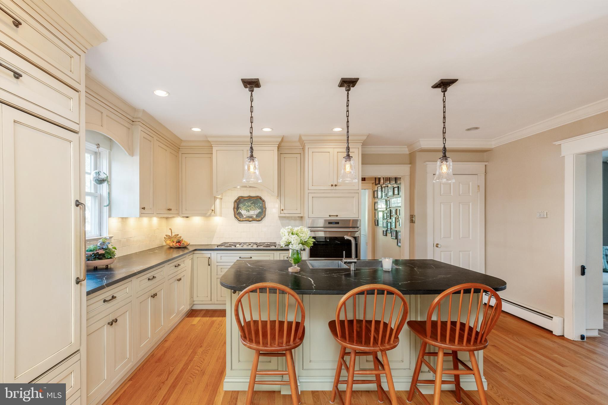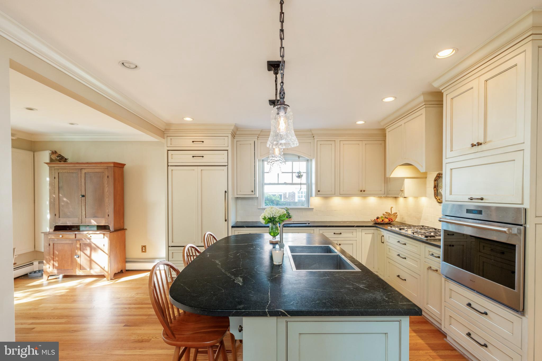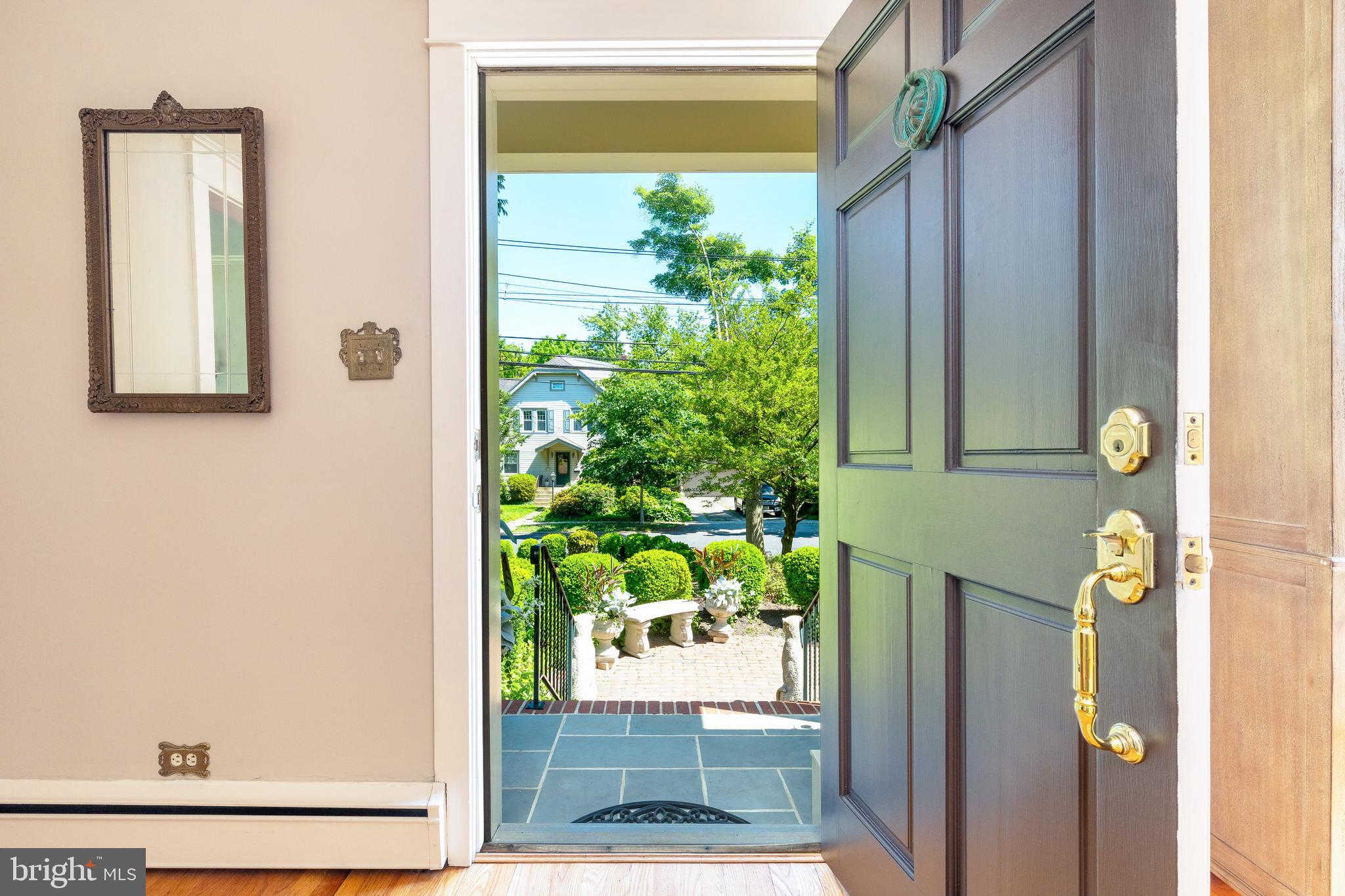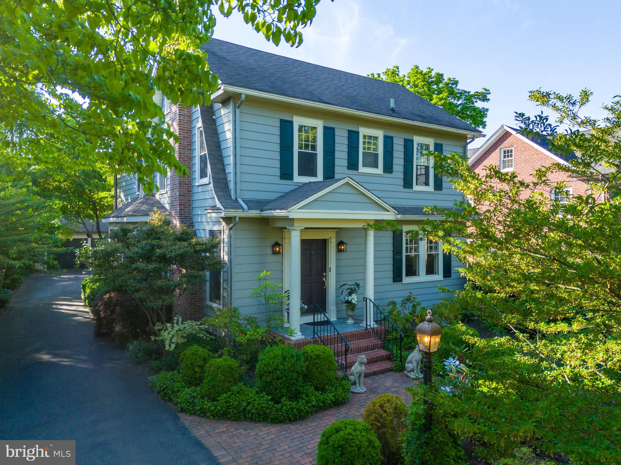 Welcome to this stunning single-family Colonial home in the highly sought-after neighborhood of Haddonfield, New Jersey. A GOLDEN opportunity awaits. Nestled among beautiful trees with a well-manicured lawn, this home boasts impressive landscaping in both the front and back yards. The property features a two-car garage and a wide driveway that can accommodate up to eight cars. As you enter, you'll be greeted by a sunlit living room with massive windows adorned with custom wood shutters, a cozy fireplace, and a grand staircase. The meticulously matched old moldings and custom additions enhance the home's classic charm. Gleaming hardwood floors extend throughout the entire first floor. To the right, you'll find a spacious dining room adorned with an antique chandelier and matching wall lamps. Beyond the dining room lies a coat closet and pantry closet for extra storage. The expansive kitchen features custom cabinets, a white tiled backsplash, soapstone countertops, a Miele dishwasher and stovetop, a brand new XO hood vent, a new Wolf wall oven, a Sub-Zero fridge, a large breakfast island and additional desk area or dining space off the back of the kitchen looks out to the brick paver patio. Adjacent to the kitchen, the family room is equipped with wall shelving and a ceiling fan. A half bath with Toto toilets completes the ground floor. The second-floor houses five bedrooms, all with manufactured flooring, original woodwork and ceiling fans. The home also has a two-zone heating and air conditioning system. Two full bathrooms are located upstairs, with a laundry chute from the primary bathroom leading directly to the washer and dryer in the basement. The unfinished basement provides a spacious area currently used for storage and laundry, complete with cabinets and shelving that will remain. Outside, the rear porch features a ceiling fan and a stationary canopy, offering a comfortable outdoor living space. The backyard is lush with greenery, well-trimmed grass, and charming spots for relaxation. The level of care and attention is evident from the brick pavers to the well maintained fire pit area and over to your rare two car garage. This home is minutes away from the Haddonfield subway station, Haddonfield Middle School, Penny's Bagels, The Bistro at Haddonfield, Saxbys, Mare Monte, and several shopping malls, making it perfectly situated for convenient living. Make this your forever home and schedule a viewing today!