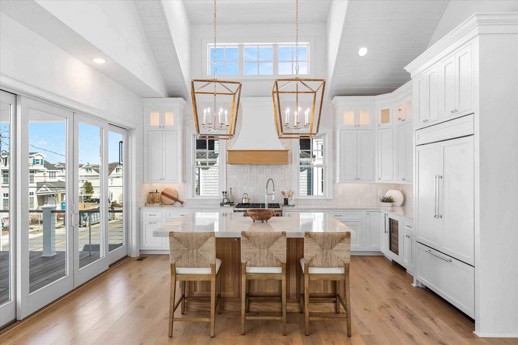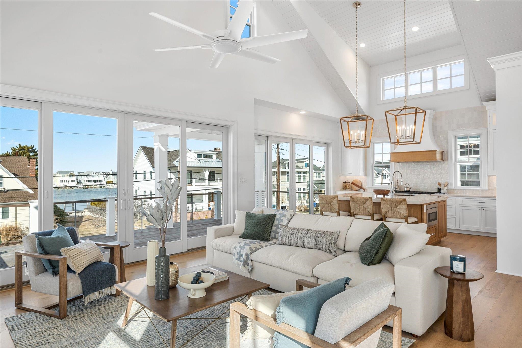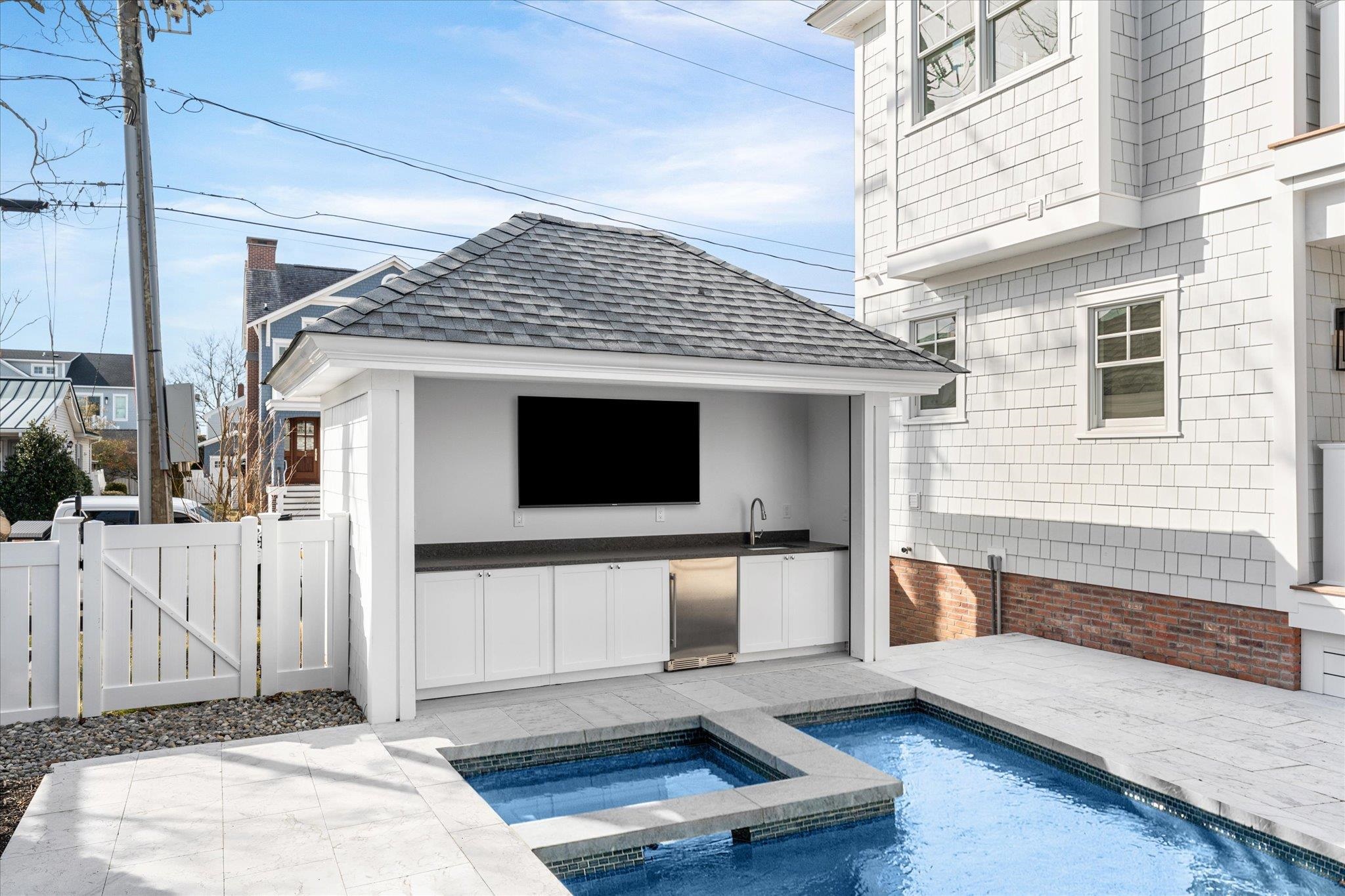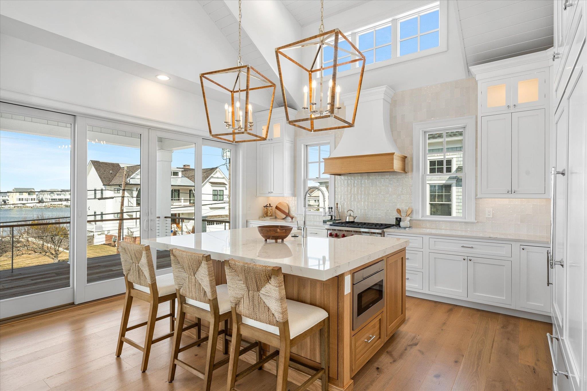 Nestled in the heart of Stone Harbor, 274 106th Street is a newly constructed residence designed by the renowned OSK Design Partners, offering the ultimate in coastal sophistication and luxury. This six-bedroom, six-bathroom sanctuary features sweeping views of Carnival Bay, where the sun sets in breathtaking fashion. Perfectly positioned for those seeking the finest in shore living, the home is located just ten blocks from 96th Street, offering both proximity to restaurants and shops and privacy. Set on a coveted corner lot with an abundance of light and air, this exceptional property spans 3,230 square feet of meticulously designed living space. Fully furnished and move-in ready, the home seamlessly blends modern elegance with the timeless coastal charm of Stone Harbor. The focal point of this remarkable home is the expansive, unobstructed southwestern-facing bay views, visible from multiple decks spanning over 1,400 square feet. Whether you're sipping coffee at sunrise or enjoying cocktails at sunset, the panoramic views provide a serene and unparalleled backdrop for everyday living. The spacious interior is thoughtfully designed with six generously sized bedrooms, four full bathrooms, and two powder rooms, offering privacy and comfort for both family and guests. On the first floor, the oversized lot allows for a uniquely large family room, complete with coffered ceilings and a white oak wet bar with under-counter Sub-Zero refrigeration. In addition to the family room, there is a spacious laundry room and a powder room with its own convenient, tiled entrance off the pool. The first floor also features four bedroom suites, two of which have private access to the front covered deck with bay views. The fourth bedroom is a must-have custom bunk room for children or grandchildren. Lastly, a versatile, cozy space is currently designed as an office but offers endless possibilities-- whether transformed into a walk-in wine cellar or repurposed for additional storage to suit your needs. At the heart of the home is the gourmet kitchen, outfitted with top-of-the-line Sub-Zero, Wolf, and Bosch appliances, custom maple cabinetry, a walk-in pantry, and a large, functional center island. Adjacent to the kitchen, the two-story great room features vaulted ceilings, exquisite tongue-and-groove wood paneling, a gas fireplace, expansive dining area, and oversized windows that bathe the space in natural light while framing the stunning bay views. Rounding out the second story, you'll find an additional guest bedroom with southeastern exposure, as well as the luxurious primary suite. The primary suite is a true retreat, complete with a private covered deck, walk-in closet, custom bath with a double vanity, and a spa-like walk-in shower. Step outside into your own private backyard oasis, featuring a custom gunite pool with a six-person spa and sun shelf, all framed by a luxurious sandblasted marble patio. Adjacent to the pool, a charming cabana with a wet bar and ample storage provides an ideal space for poolside gatherings or quiet retreat. Additionally, the third-floor roof deck offers breathtaking panoramic views, with a convenient wet bar just inside--perfect for enjoying sunset cocktails during countless happy hours. This home is equipped with an audio system, HD CCTV security cameras, and sophisticated exterior lighting, elevating both convenience and ambiance. Throughout the home, custom cabinetry, premium finishes, and impeccable craftsmanship are evident, ensuring an unparalleled level of luxury. Perfectly situated in the quieter south end of the island, 274 106th Street offers the rare combination of privacy and proximity to all that Stone Harbor has to offer. Whether you are looking to entertain, unwind, or simply enjoy the beauty of coastal living, this exceptional residence provides it all.