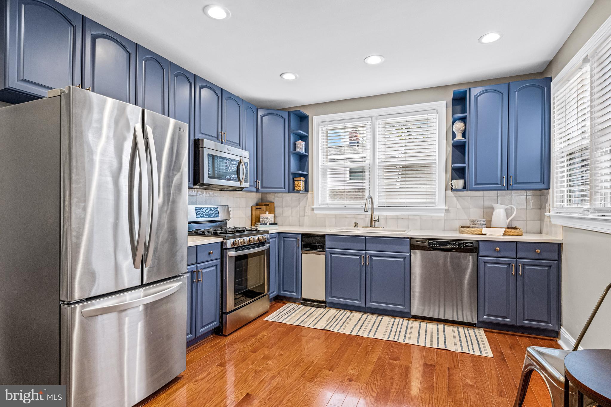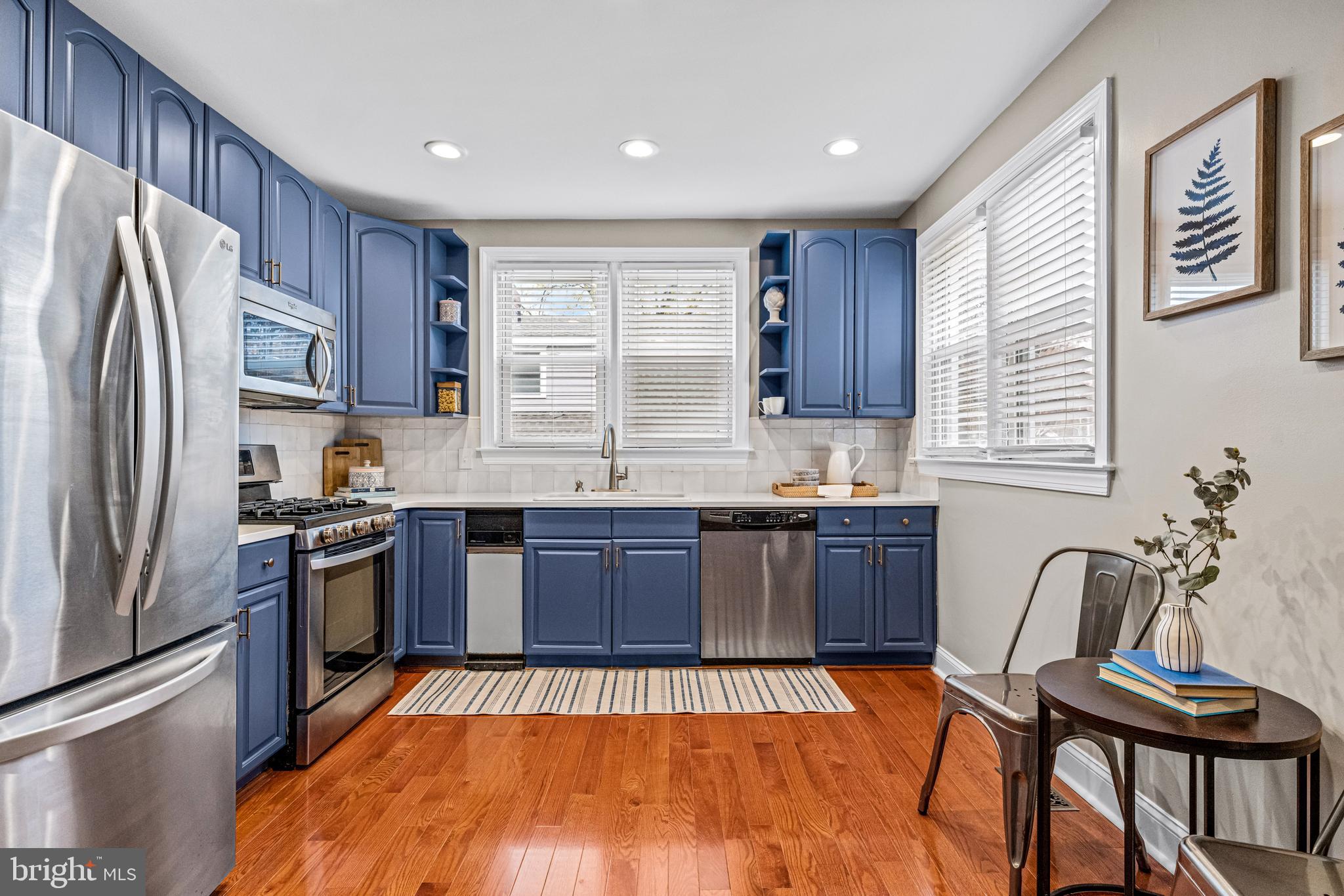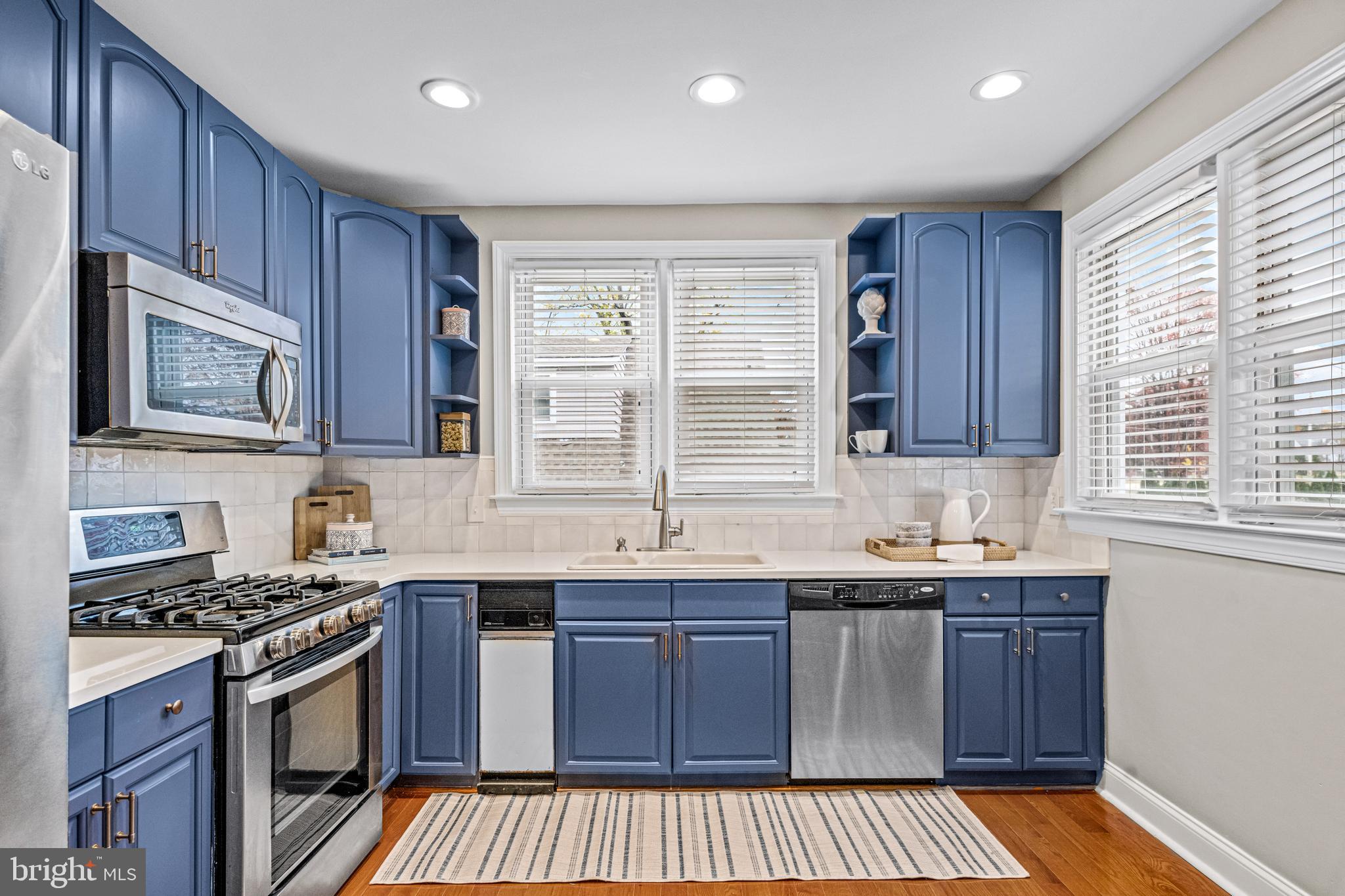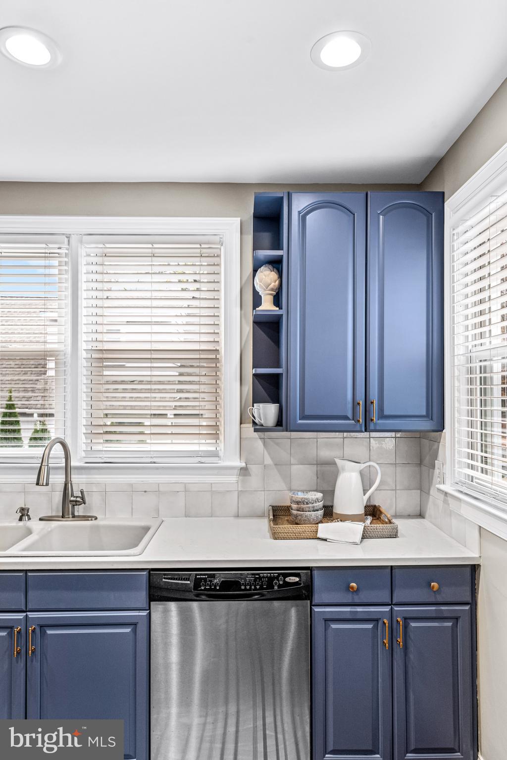 The remodeled kitchen boasts gorgeous blue cabinetry with brass hardware, textured clay tiled backsplash, quartz countertops, stainless steel appliances, and a new kitchen floor. A newly-added wall of additional cabinetry offers even more storage in the kitchen. Off the kitchen is a convenient mudroom with a half bathroom and newer washer and dryer, adding practicality and functionality to the home. Downstairs is a large basement that offers ample storage.