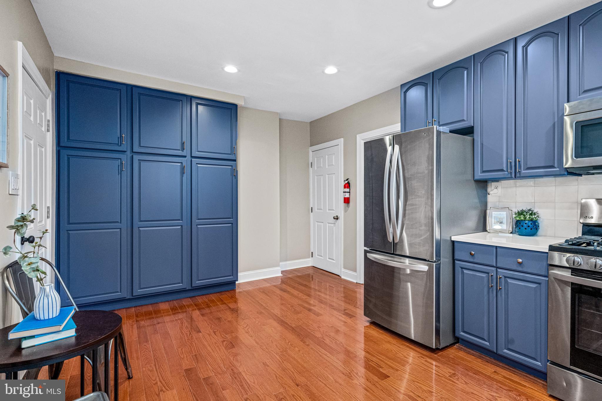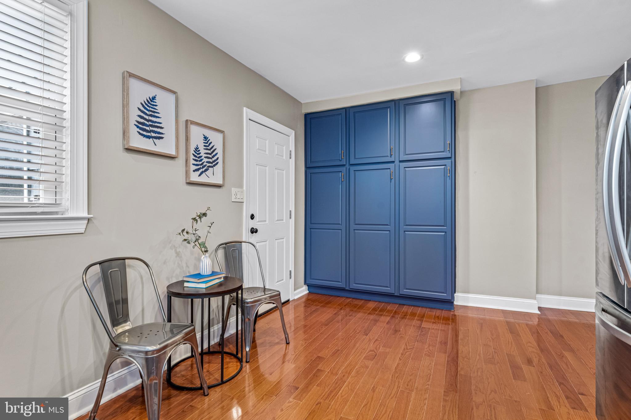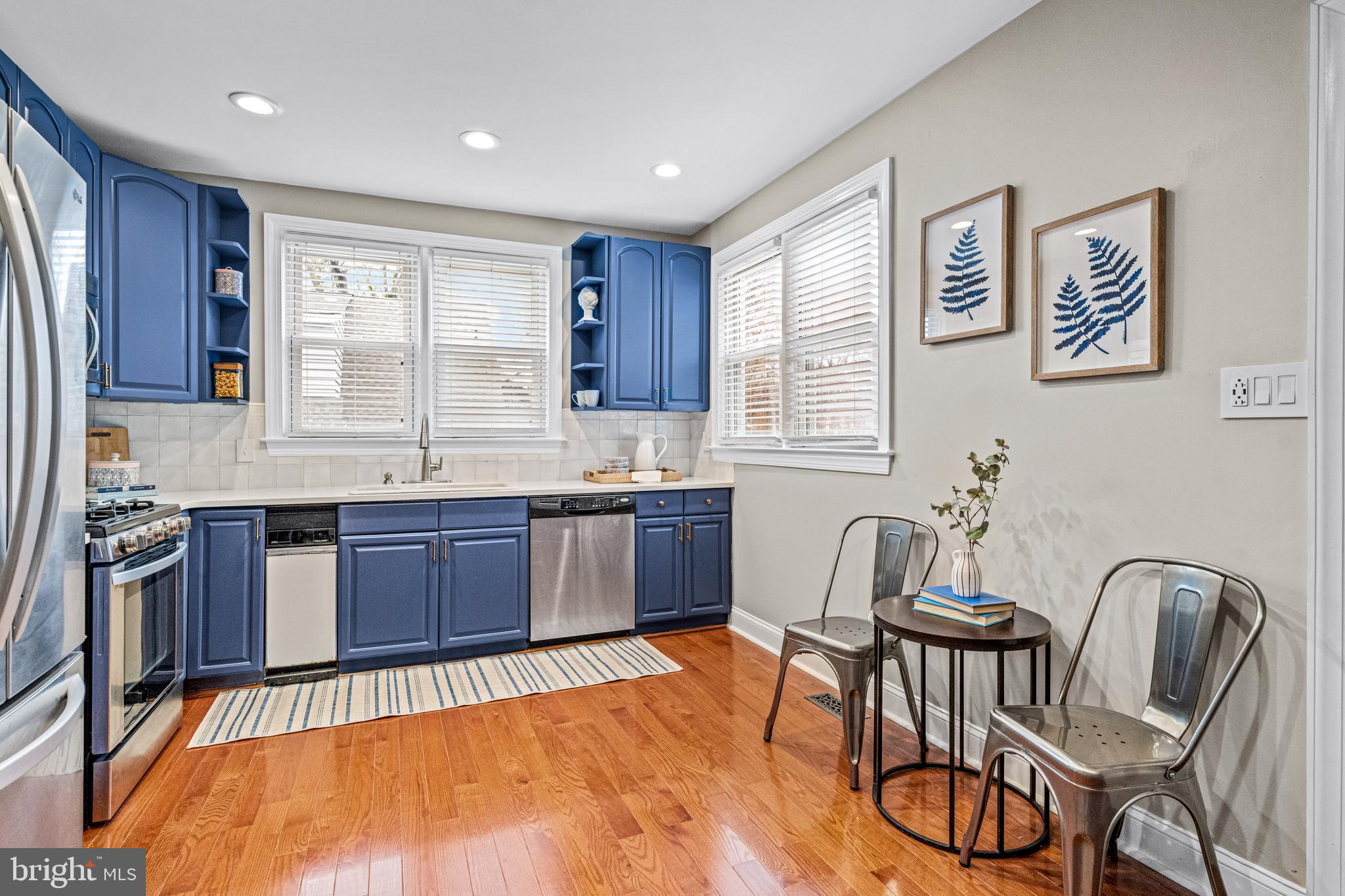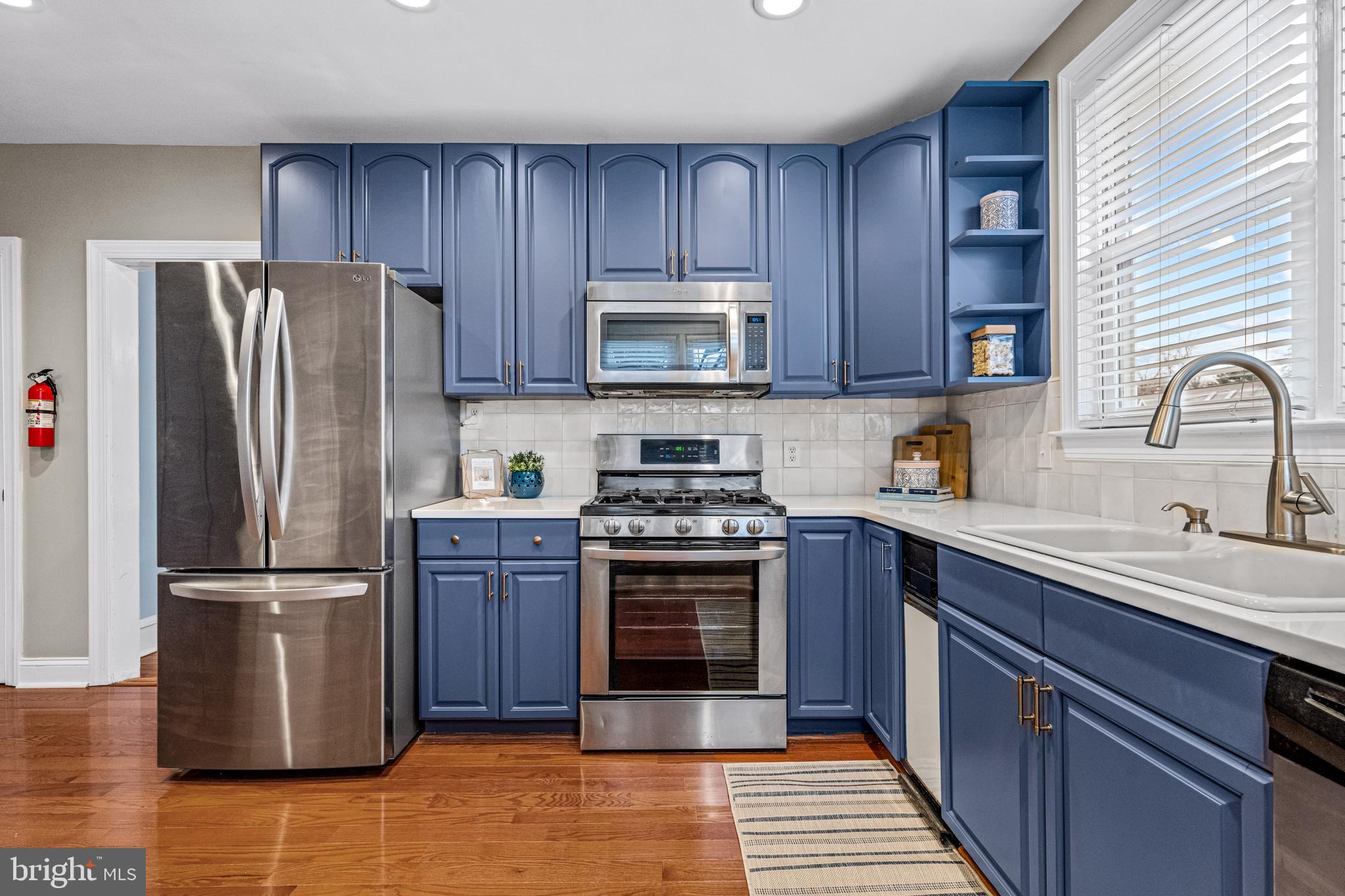 The remodeled kitchen boasts gorgeous blue cabinetry with brass hardware, textured clay tiled backsplash, quartz countertops, stainless steel appliances, and a new kitchen floor. A newly-added wall of additional cabinetry offers even more storage in the kitchen. Off the kitchen is a convenient mudroom with a half bathroom and newer washer and dryer, adding practicality and functionality to the home. Downstairs is a large basement that offers ample storage.