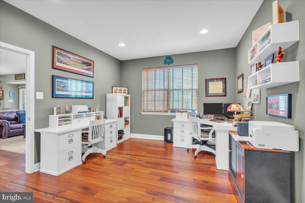 Entering into the grand foyer you will immediately appreciate the spacious living room and gorgeous dining room offering ample space for entertaining. The main level also features a gourmet kitchen with a center island, granite countertops, and stainless steel appliances, seamlessly flowing into the family room with cathedral ceilings and a magnificent 2-story stone fireplace. Off of the family room is a large office space, perfect for those that work from home! Rounding off the first floor is the half bath and laundry room, as well as access to the 2-car attached garage.